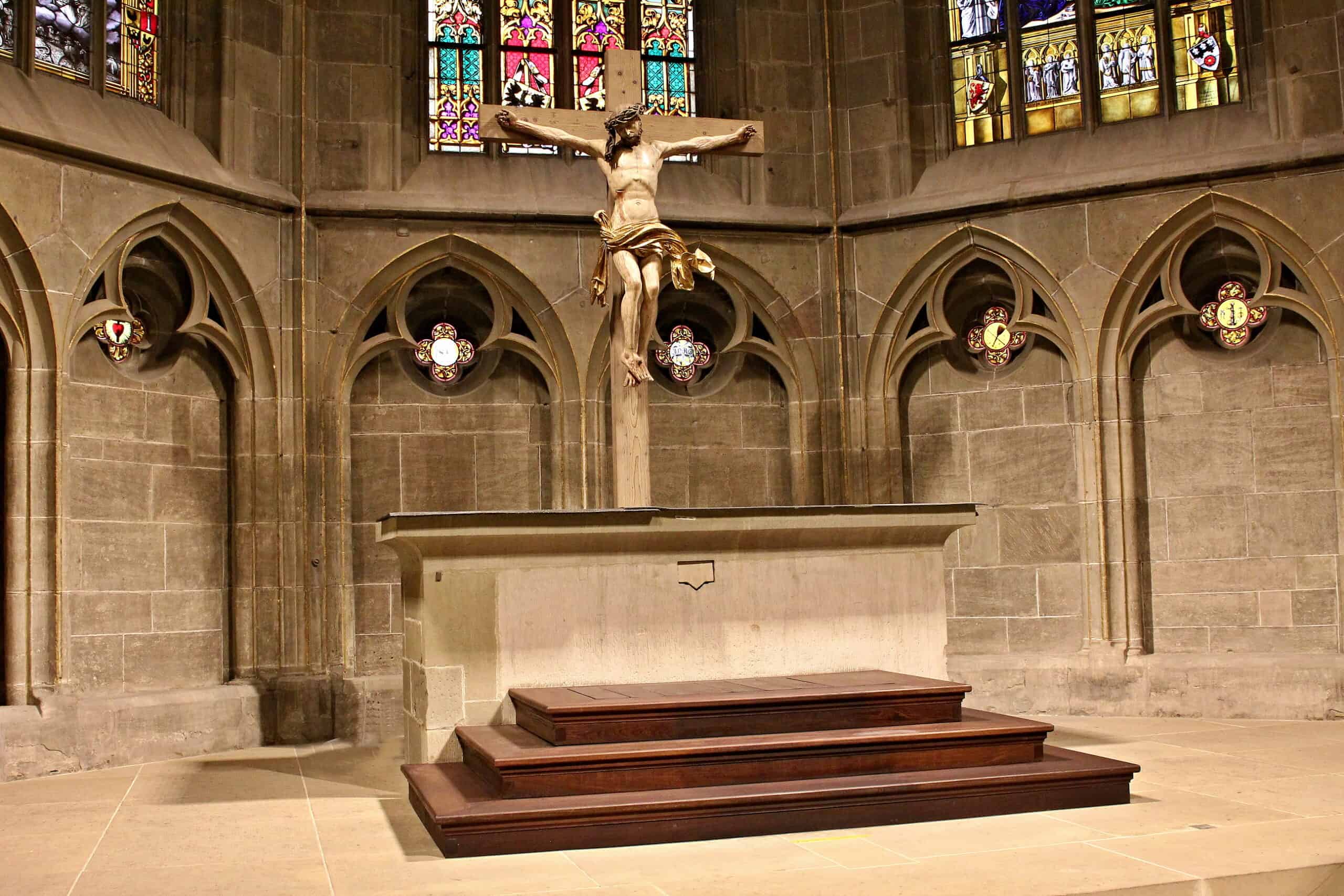 Bei der letzten Renovierung des Münsters vor drei Jahren wurde dieser Altar auf eine zusätzlich eingebaute sogenannte Altarinsel gestellt, man rückte ihn noch näher zu den Gläubigen in Richtung Kirchenschiff. Da kam optisch auch der ehemalige Hochaltar mit dem großen Kruzifix wieder mehr zur Geltung.