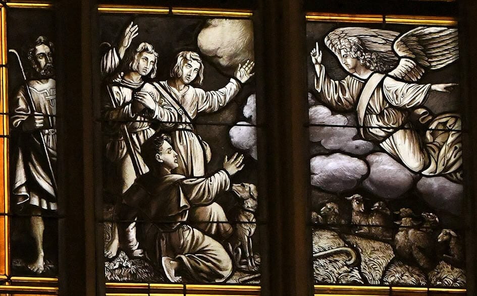 Aus dem links daneben platzierten Weihnachtsteil sind Engel überraschend ausgelagert. Das Segment mit der Krippendarstellung kommt ohne sie aus. Ihren Betlehem-Auftritt haben die Boten darunter: In einer grisailleartig verdunkelten Szenerie verdeutlicht ein dynamisches Flügelwesen den verdutzten Hirten, dass sich Großes zugetragen und wohin sie nun flugs zu gehen haben.