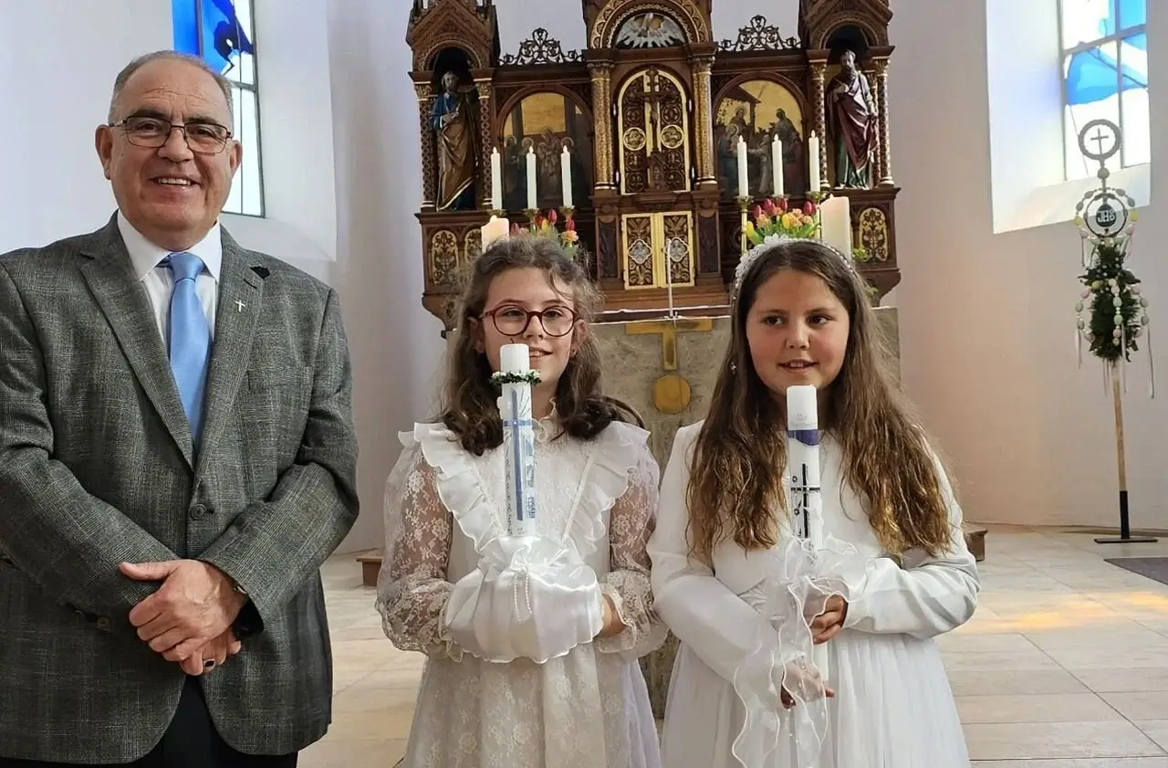 Rottweil-Neukirch – In einem feierlichen Gottesdienst, vorbereitet und gestaltet von Igor Begic und seinem Team, zelebriert von Pfarrer Jürgen Rieger und musikalisch begleitet von Martina Kummer gingen Emma Keller und Raphaela Wuhrer zum ersten Mal zur heiligen Kommunion und erklärten ihren Glauben an Jesus Christus.