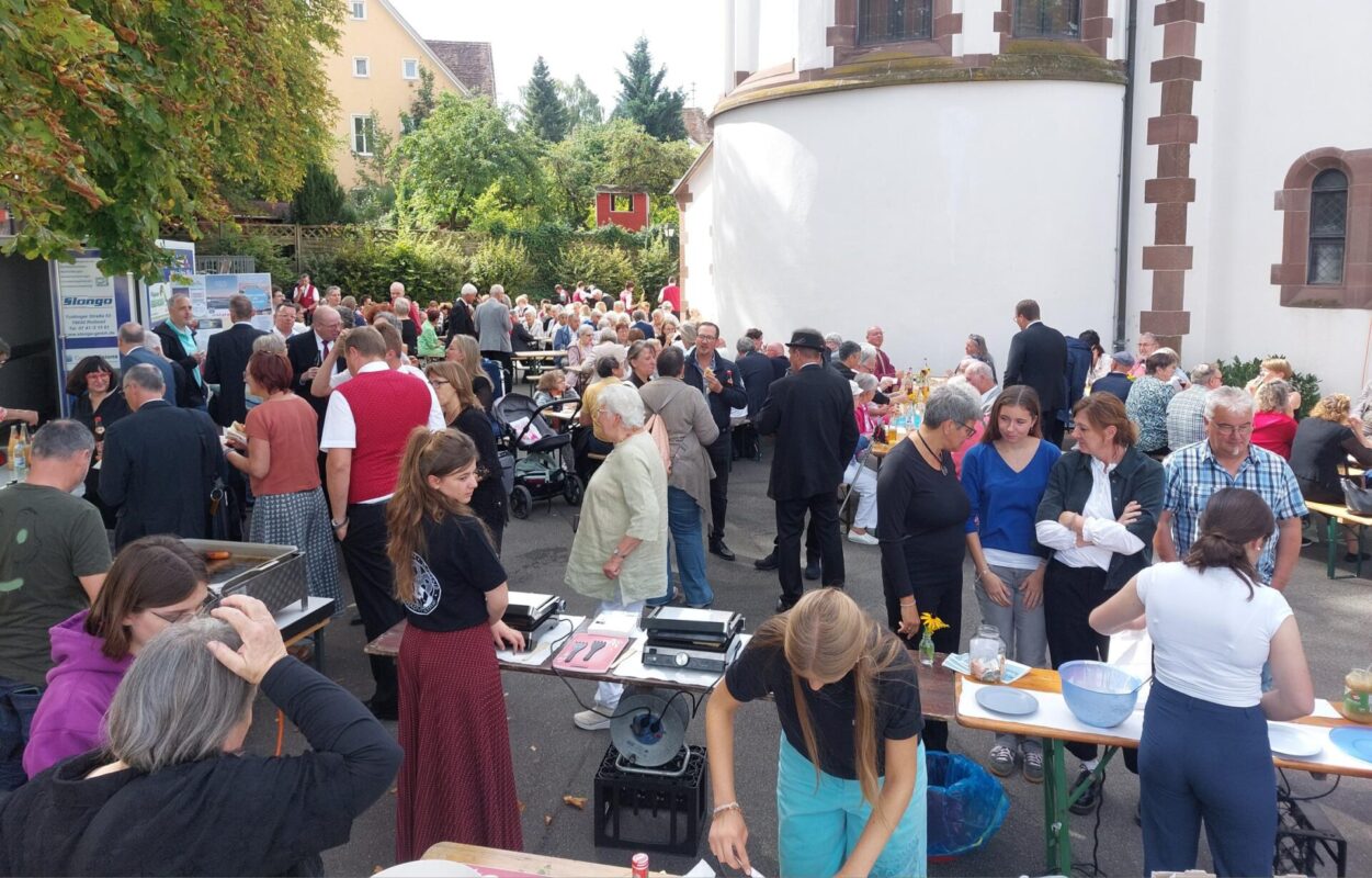 Anschließend lud die Kirchengemeinde zu einem gemütlichen Beisammensein an der Apsis der Pelagius-Basilika ein, wobei die Pelagiusjugend Altstadt eine tragende Rolle übernahm. Bei herrlichem Wetter nutzten viele, noch ganz erfüllt vom festlichen Gottesdienst, die Gelegenheit gerne. Der Musikverein Frohsinn, ebenfalls unter der Leitung von Axel Zimmermann, rundete die herzliche Gesamtatmosphäre schwungvoll ab.