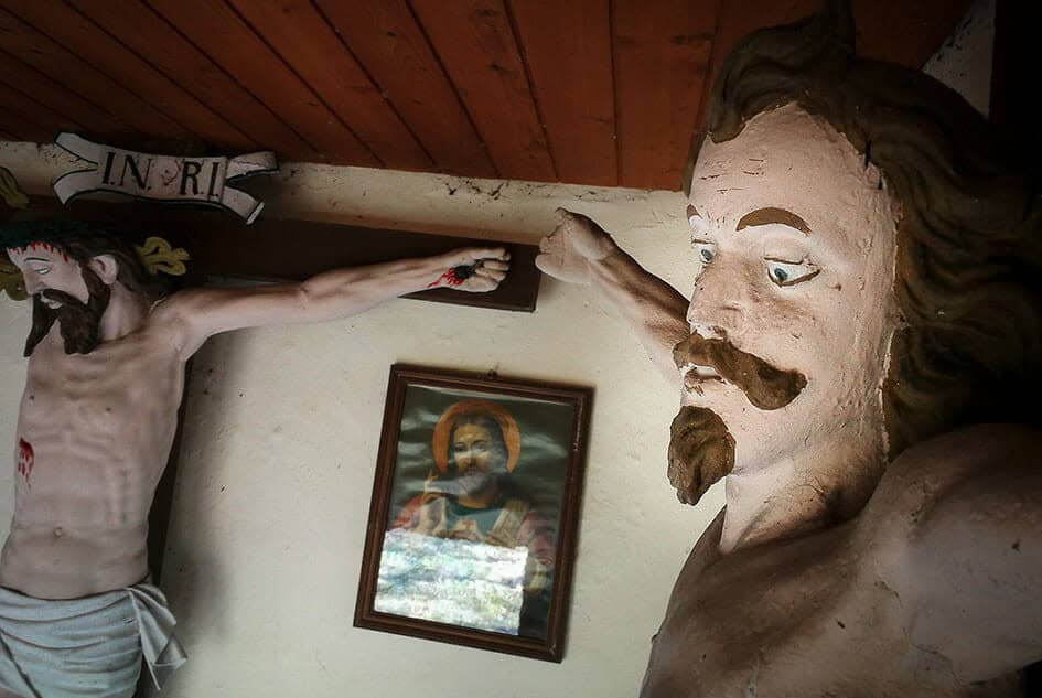 Die Enge im kleinen, keine vier Quadratmeter messenden Raum macht die Atmosphäre noch beklemmender. Man muss den Kopf recken, um in die Gesichter sehen zu können, muss aufblicken zu dieser grausamen Hinrichtungsszene, die einem hier bestürzenden nahe gerückt wird. Ins Auge sticht dabei vor allem der Delinquent, der von Jesus aus gesehen links hängt: Er blickt aus aufgerissenen Augen, hat verbissene Gesichtszüge, die Arme zerren an den Fesseln, die ihn erbarmungslos am Balken halten.