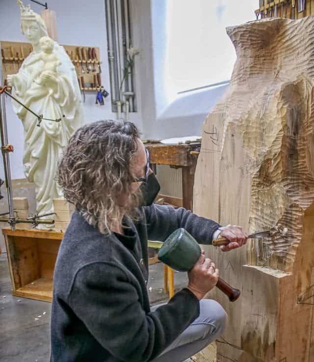 Dieser Vorgang wiederholt sich so oft, bis sie am gesuchten Punkt angekommen ist. Erkennbar sind bereits der Kopf der Madonna und das Jesuskind. Die Bearbeitung erfolgt von oben nach unten, dann von vorne nach hinten. Es wird wohl noch etliche Wochen dauern, bis mit der Feinarbeit und der Oberflächenbearbeitung begonnen werden kann.