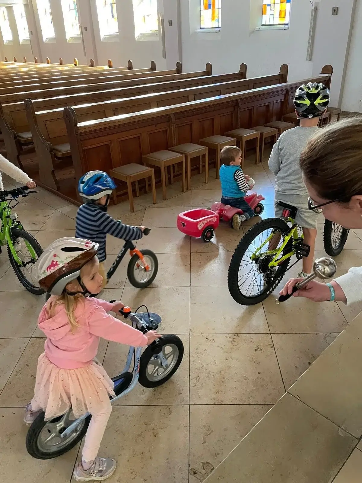Highlight der Kinderkirche war jedoch die Fahrzeugsegnung in der Kirche St. Konrad. Zum Schluss der Kinderkirche durften alle mit ihren Fahrrädern, Bobbycars und den weiteren fahrbaren Untersätzen eine Runde in der Kirche drehen, bevor es von Gemeindereferentin Tanja Fischer den Segen gab. Als Erinnerung gab es für jedes Fahrzeug einen Christopherusaufkleber. Der Heilige Christopherus ist der Schutzpatron für Reisende und steht für eine gute Fahrt und ein sicheres ankommen.