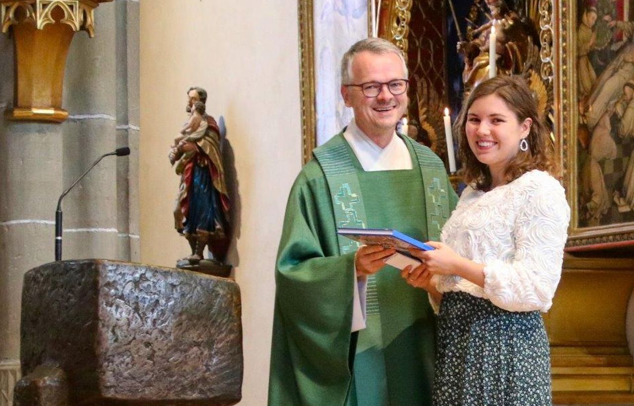 Rottweil – Sie stammt aus Wurmlingen bei Rottenburg, ist 23 Jahre alt und hat ihr Studium in Theologie und Französisch an der Universität Tübingen abgeschlossen. Sie wird nun für drei Jahre in Rottweil sein um ihre Berufsausbildung zur Pastoralreferentin mit der praktischen Arbeit fortzusetzen. Die Berufseinführung endet dann mit der Zweiten Dienstprüfung. Sie sei mit großer Begeisterung auch Sängerin und seit ihrer Kindheit in der Rottenburger Domsingschule aktiv. Eine Sangesprobe gab sie bereits im Gottesdienst, als sie die Antiphonen und das Halleluja vor dem Evangelium sang.