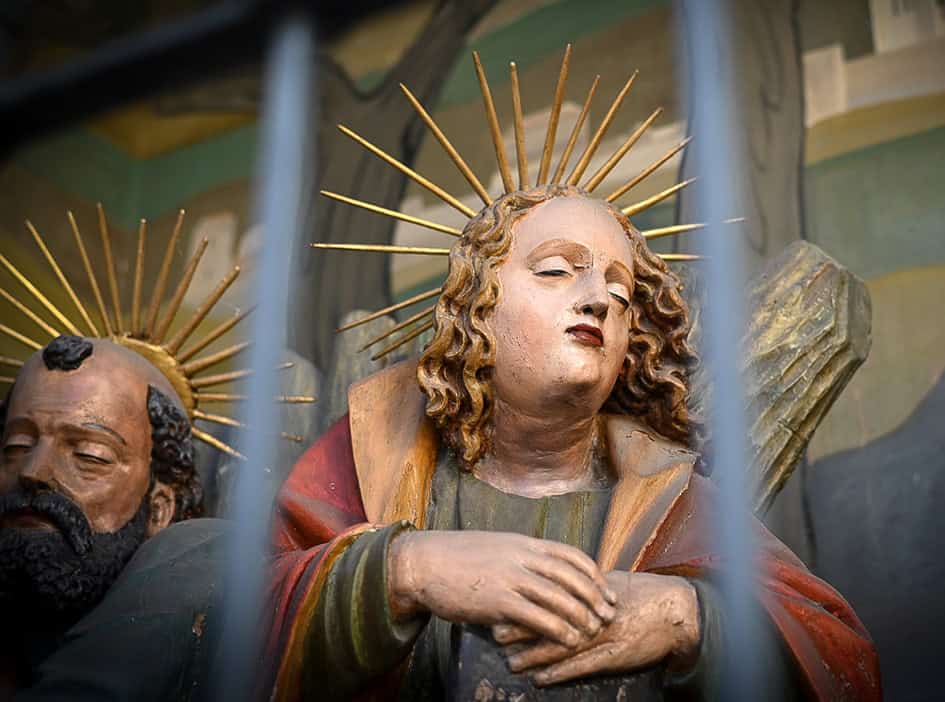 Dort spitzt sich das Geschehen dann dramatisch zu: Jesus ermahnt sie, wach zu bleiben und zu beten, während er selber sich etwas abseits begibt. Er weiß, dass er gefangen genommen wird. Von Furcht gepeinigt tritt er in Zwiesprache mit Gott. Aber seine Freunde sind ihm in seiner Not keine Unterstützung – der Schnitzer der Rottweiler Ölberggruppe zeigt dies an der Zweier-Gruppe aus Petrus und Johannes sowie der Einzelfigur des Jakobus deutlich an: Von diesen Kerlen mit eingesunkenen Körpern und geschlossenen Augen ist kein Beistand zu erwarten.