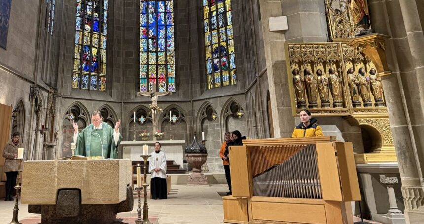 Die große Haupt-Orgel des Münster, ein Instrument der berühmten Bonner Orgelbaufirma Klais, wird seit der vergangenen Woche gereinigt und restauriert. Die kleine Chor-Orgel, die seitlich des Altares ihren Platz gefunden hat, gibt die Möglichkeit, dass die jeweiligen Organisten sichtbar sind mit Blick-Kontakt zur Gemeinde.