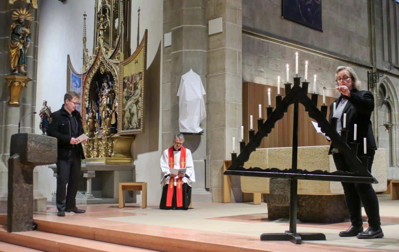 Bei der Feier der Karfreitagsliturgie mit Diakon Michael Wollek standen die Leidensgeschichte, die Fürbitten und die Verehrung des Kreuzes im Mittelpunkt der schlichten Feierstunde. Die Karmette am Abend des Karfreitags, eine Andacht aus Psalmen, den Klageliedern des Propheten Jeremia und Lesungen, fand in der schmucklosen Kirche statt. Der Tenebrae-Leuchter stand im Zentrum der Feier. An ihm brennen 15 Kerzen in Dreiecksform. Vierzehn Kerzen gelten als Symbole für elf Apostel und drei Marien: Maria Kleophae, Maria Salome und Maria von Magdala. Zusätzlich steht als Symbol für Christus eine größere 15. Kerze in der Mitte. Nach jedem Psalm (gesungen von Christian Groß) oder jeder Lesung wird eine Kerze gelöscht. Am Schluss des Gottesdienstes brennt noch die Christuskerze.