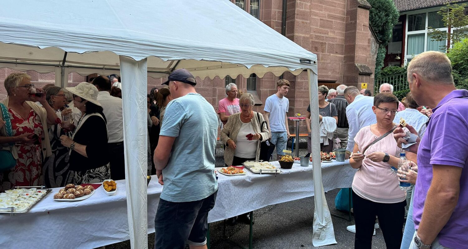 Im Anschluss versammelten sich die Gäste hinter der Kirche, wo bei Sekt und Häppchen Gelegenheit für persönliche Gespräche und Abschiedsworte bestand. Leider sorgte ein plötzlicher Regenschauer dafür, dass viele unter Pavillons oder in die Kirche ausweichen mussten.