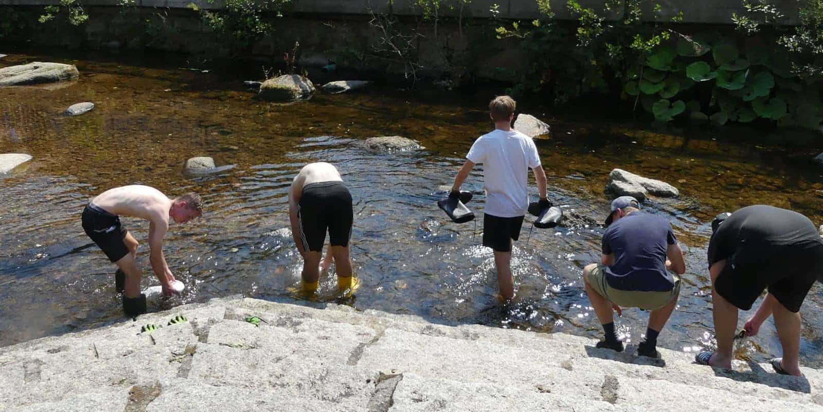Nach vier Stunden Schwitzen und Schuften versammelt Wild seine Gruppe nochmal. Mönch bedankt sich bei den Schülerinnen und Schülern, die nun vier Stunden in der Hitze unterwegs waren. „Aber so ein Tag am Wasser und dreckig werden“ sei doch auch mal eine Abwechslung.
