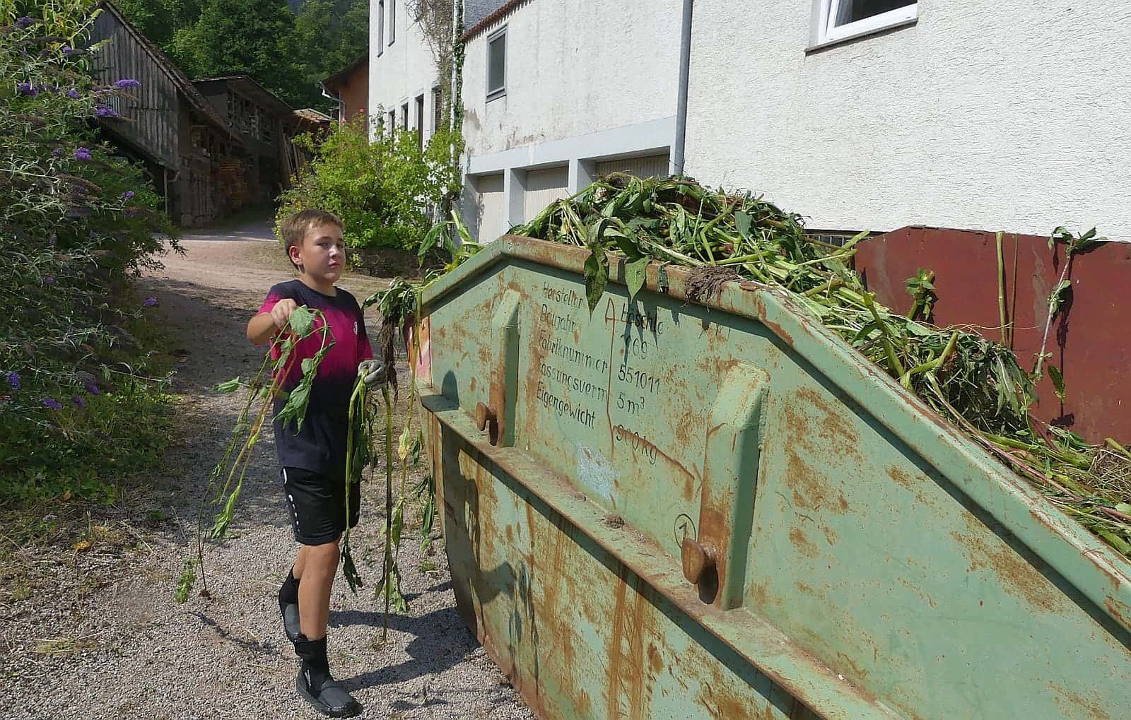 Kajan fand die Aktion „entspannt“. Er schleppt einen Sack mit Samenteilen des Springkrauts zu einem Container. Es sei zwar auch „anstrengend, aber macht richtig Spaß“. Klar bei der Hitze bietet der Berneckstrand viele Möglichkeiten, sich zwischendurch abzukühlen. „Die Müllsäcke nicht in den Container“, ruft ihm sein Lehrer Marcus Wild hinterher.