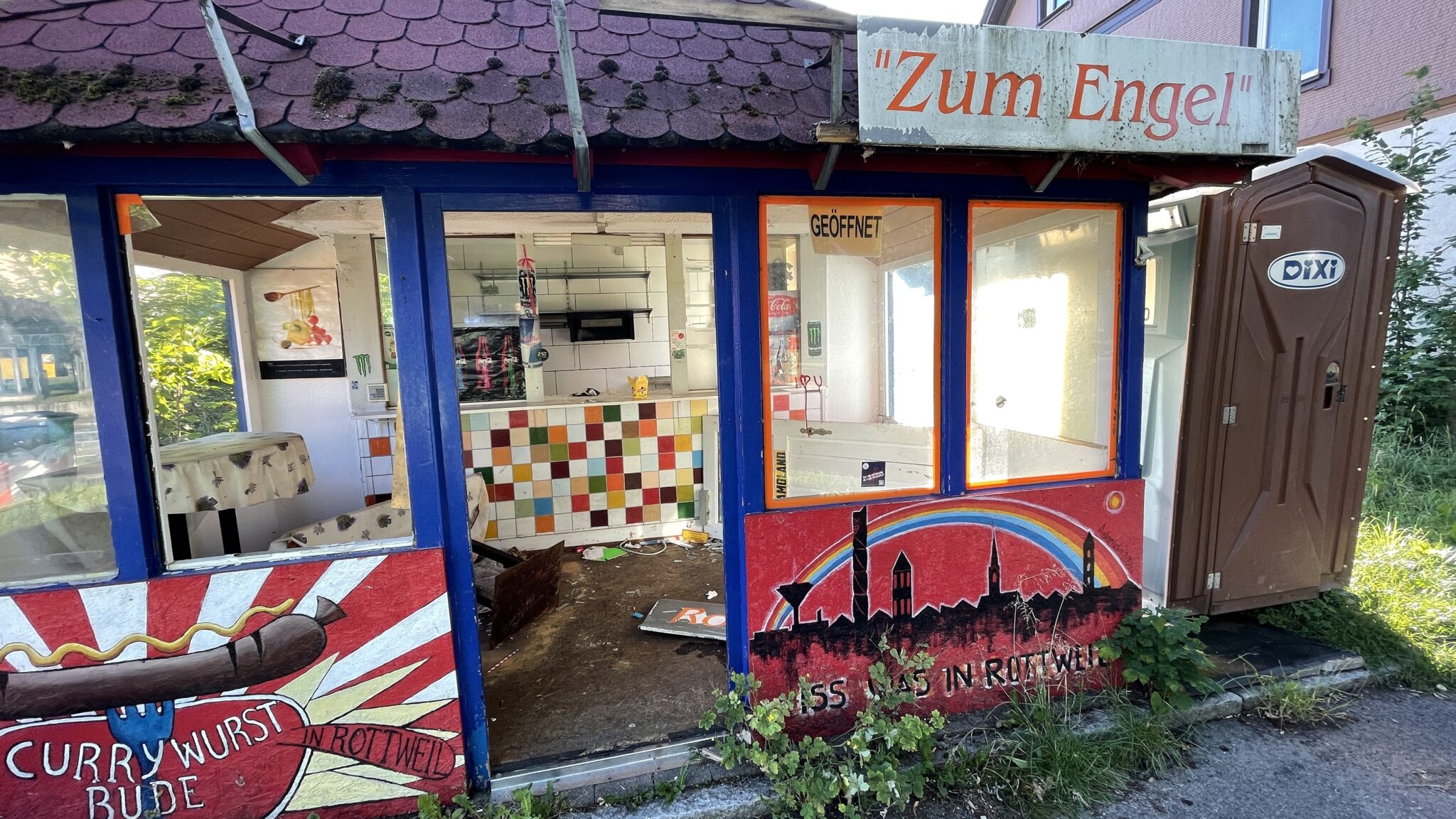 Der Imbiss „Zum Engel“ in der Rottweiler Königstraße war in den vergangenen Monaten Ziel von Vandalen. Wo es früher Currywurst und Bier gab, herrscht jetzt das blanke Chaos. Umgeworfenes Inventar, zerdeppertes Porzellan, eine liegende Tür mit eingeschlagener Scheibe. Das Häuschen, einst ein beliebter Treffpunkt hungriger und wohl vor allem auch durstiger Menschen, steht da, als wäre es einfach verlassen worden. Und vergessen. Eine Pommes-Packung wartet auf dem Tresen – ja, auf was denn?