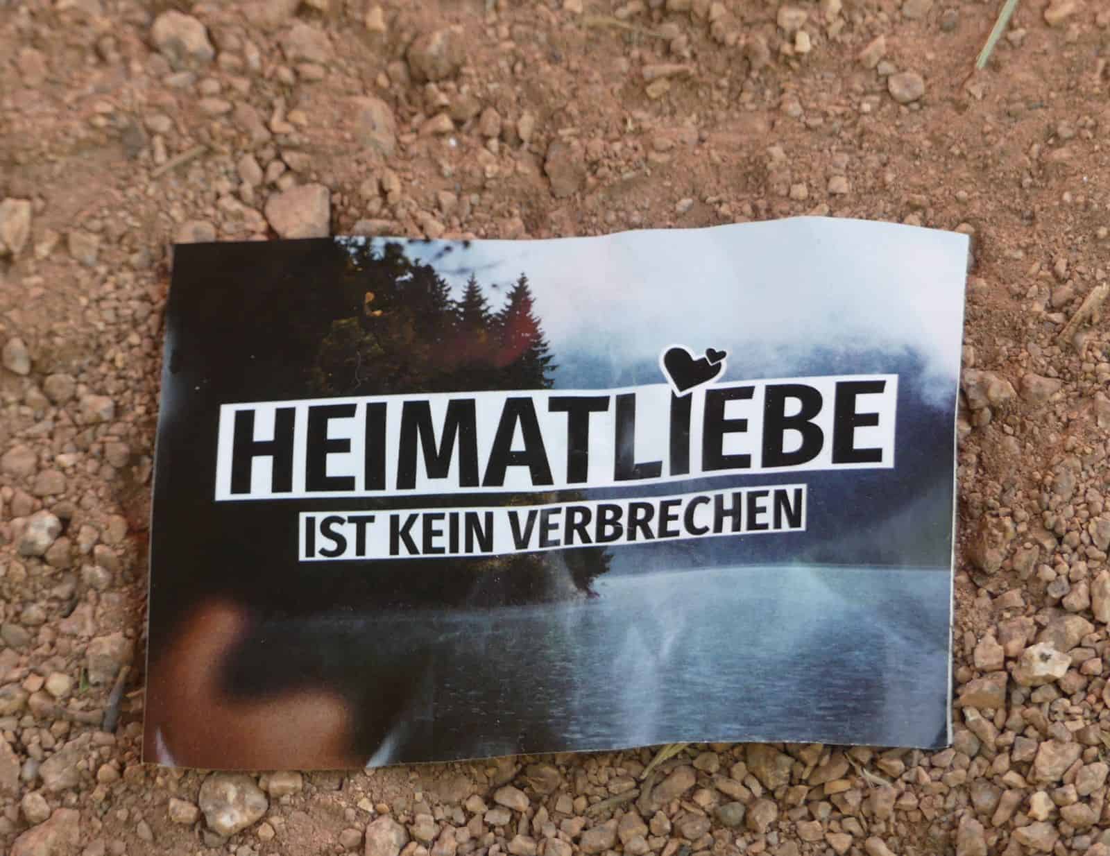 Der Spruch mit der Heimatliebe ist in rechtsradikalen Kreisen offenbar beliebt. Der rechtsextremistische „Thor Shop“ bietet den Spruch als Aufkleber denn auch in den passenderen Farben Schwarz-weiß-rot.