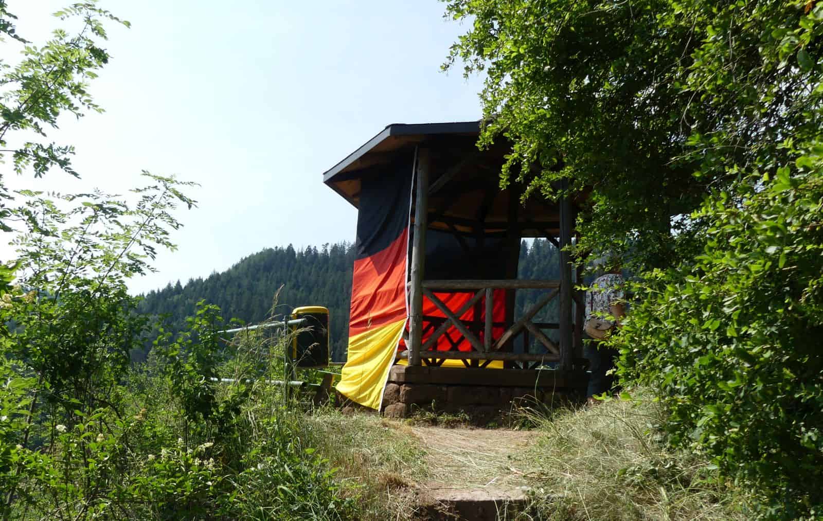 Zunächst zum Aussichtshäusle. An der  Front hin zur Stadt hat jemand sehr sorgfältig eine große Deutschlandfahne befestigt. Die Rückseite ist offen, man kann die Schutzhütte betreten. Ein Hinweis auf den Urheber oder zum Hintergrund der Aktion findet sich nicht.