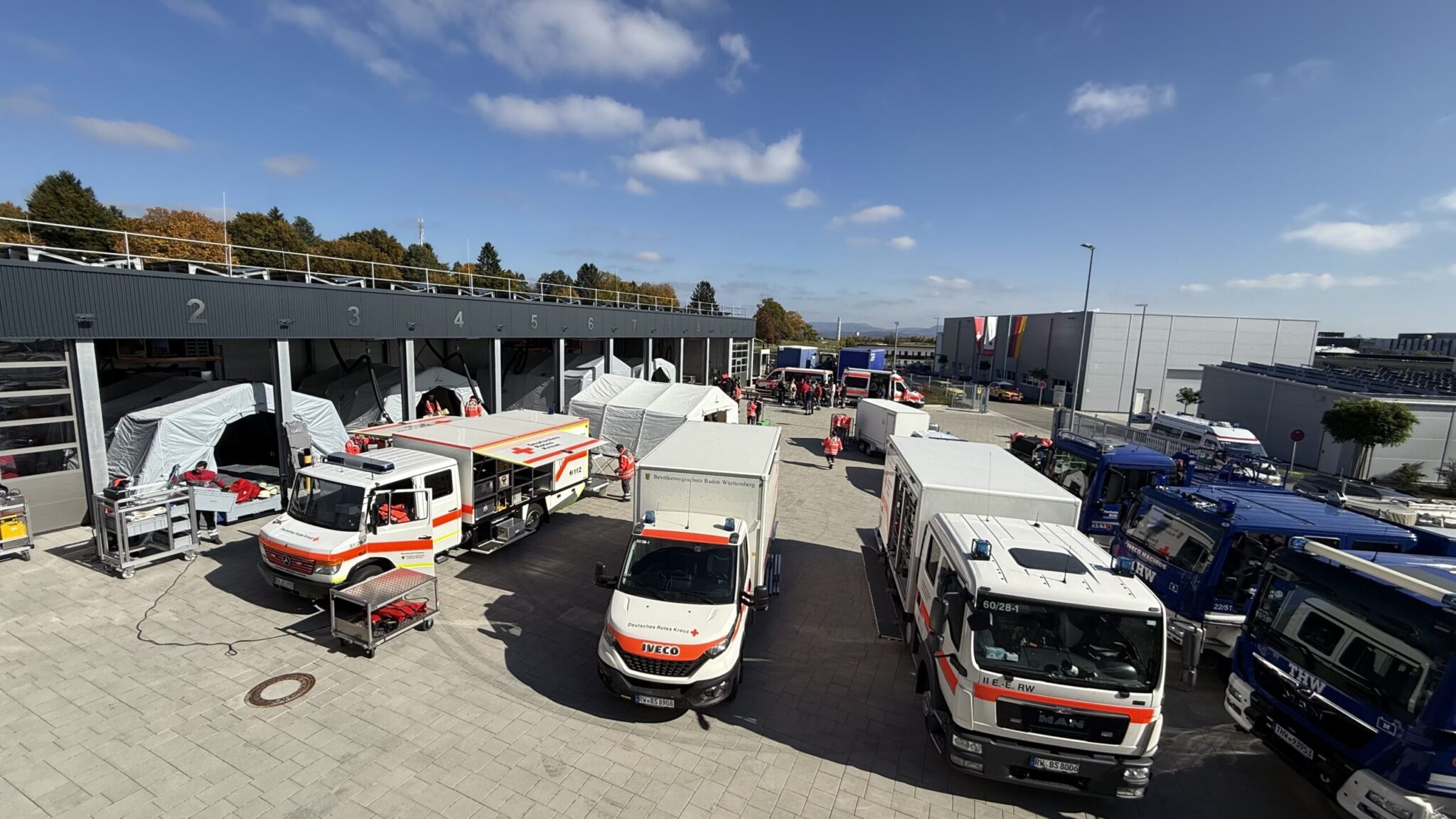 Das THW hat eigens seine Großfahrzeuge aus der Halle gefahren und Platz geschaffen (denn zwischen DRK und THW besteht im Kreis Rottweil eine Freundschaft): 51 Ehrenamtliche der DRK-Einsatzeinheiten 1, Rottweil und Villingendorf, sowie 2, Schramberg, Sulz, Sulz-Nord, Aichhalden und Lauterbach, sind hier versammelt. Gemeinsam haben sie den Behandlungsplatz aufgebaut, haben Zelte errichtet, Gestelle ausgeklappt, Kisten bereitgestellt, haben die Handgriffe geübt, die im Notfall sitzen müssen. Zwei Stunden haben sie an diesem Samstag dafür benötigt, im Notfall soll und wird das schneller gehen.