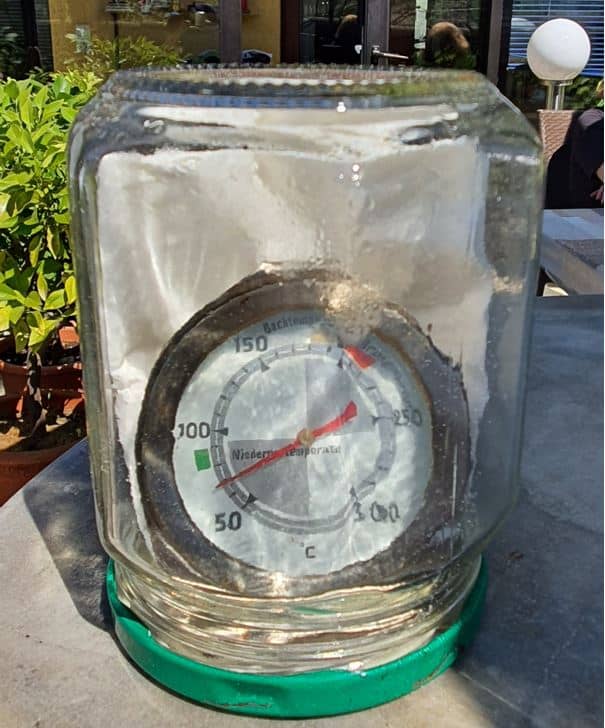 „Bei klarem Himmel ergeben sich 60 bis 70 Grad Temperatur im Glas, was Coronaviren abtötet“, so Klank. Er habe es bereits mehrfach ausprobiert und nachgemessen, die Temperatur passte jedesmal. Man brauche also kein Thermometer ins Glas stecken.
