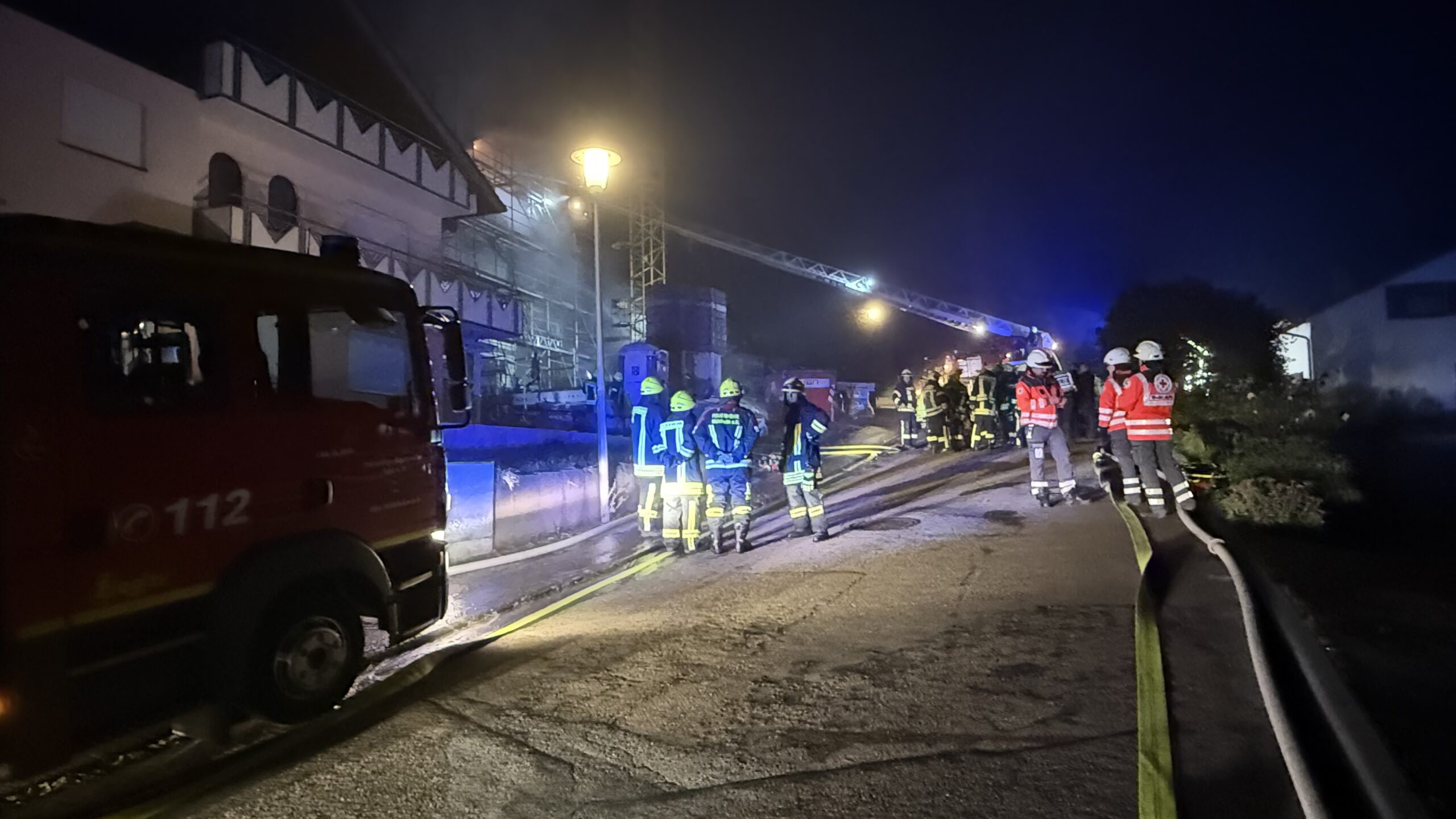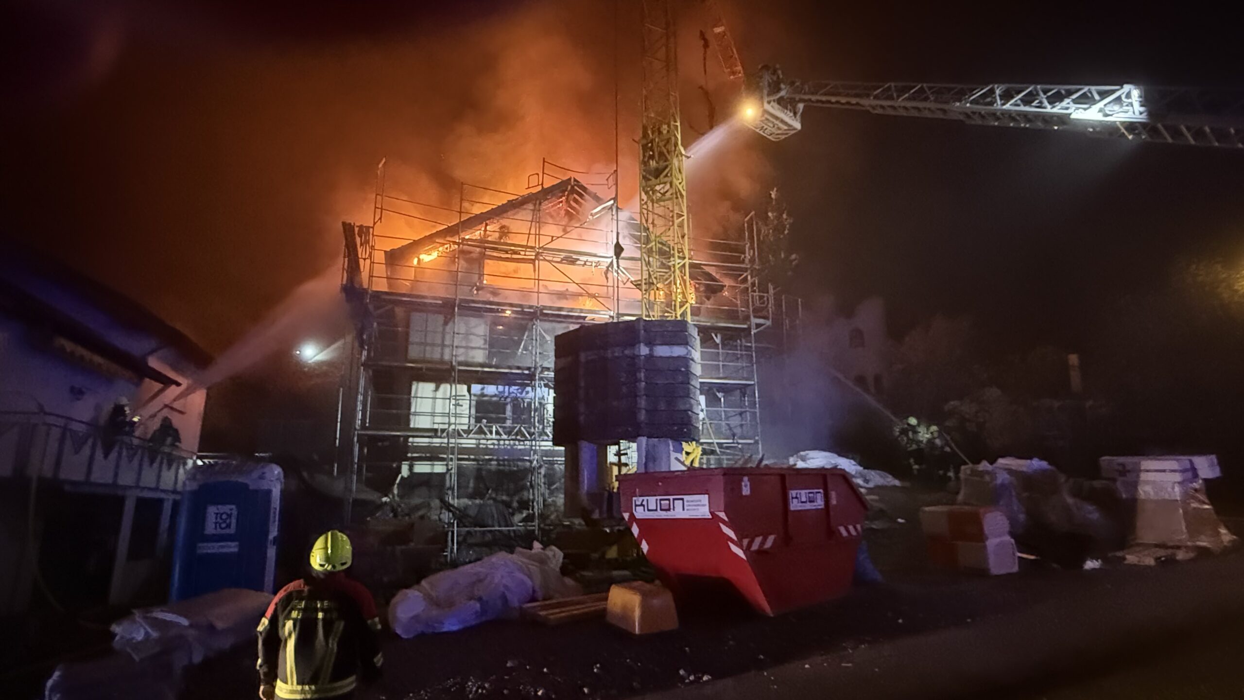 Das Feuer war aus bislang unbekannten Gründen in einem im Rohbau befindlichen Gebäude in einem Wohngebiet des Sulzer Teilorts ausgebrochen. Der Dachstuhl stand bei Eintreffen der Kräfte der Feuerwehr in Flammen. Die Feuerwehr startet sofort massive Löschangriffe. Nach Auskunft des DRK gibt es glücklicherweise bisher keine Verletzten. Neben hauptamtlichen Rettern sind auch ehrenamtliche Kräfte der Bereitschaft im Einsatz. Diese sind etwa auch zur Absicherung der Einsatzkräfte der Feuerwehr vor Ort. Und angesichts der andauernden Einsatzarbeiten auch zu deren Versorgung.