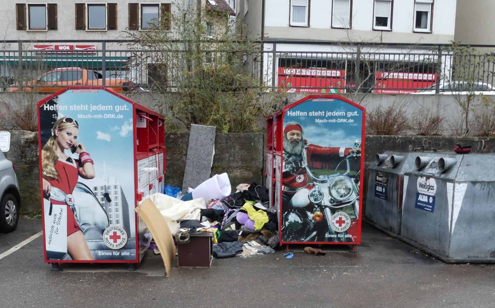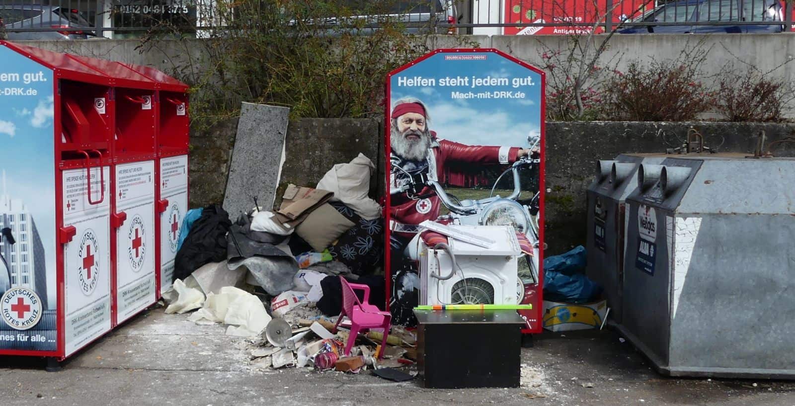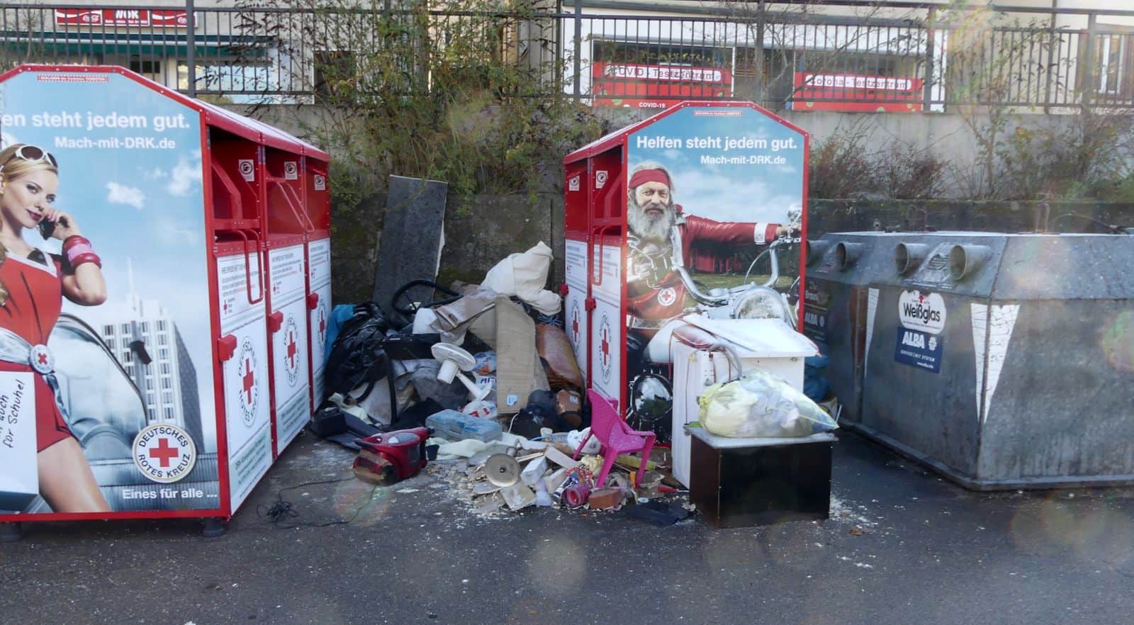 Und wie Fachbereichsleiter Matthias Rehfuß schon im November erläuterte, die Theorie der „broken Windows“ bewahrheitet sich auch hier: Lagen zunächst nur aufgerissene Säcke mit Altkleidern zwischen den Containern, kamen im Lauf der vergangenen Tage Bauschutt, Kleinmöbel, ja sogar eine kaputte Waschmaschine und andere Elektrogeräte hinzu.