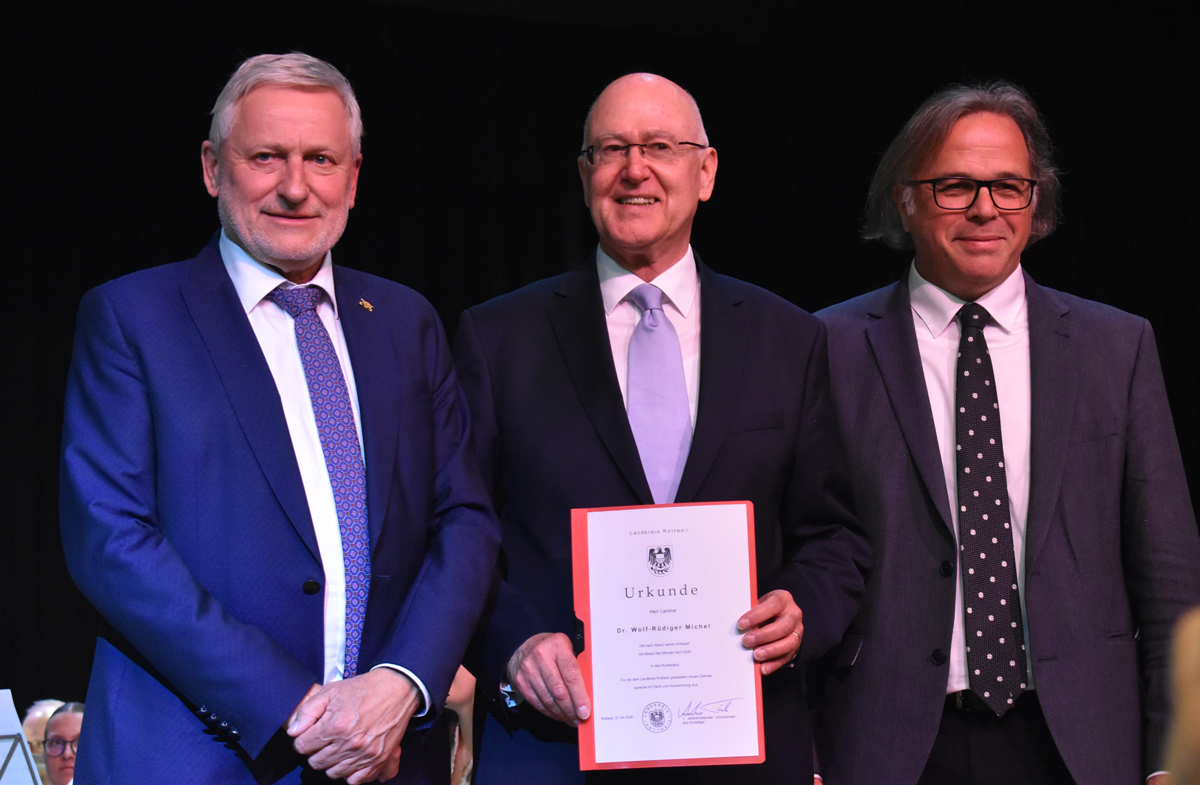 „Kaum ist der Wolf ins Jagdgesetz aufgenommen, schon zieht er sich zurück.“ Mit viel Humor würzte Dr. Achim Brötel, der Präsident des Deutschen und des baden-württembergischen Landkreistags, seine Rede. Er erwähnte auch, dass Michel seit dem vorigen Jahr Vorsitzender der Vereinigung kommunaler Arbeitgeberverbände ist. Und meinte dazu, Michel sollte auch künftig „für maßvolle Tarifabschlüsse“ sorgen. Brötel überreichte Michel die Medaille des Landkreistags.