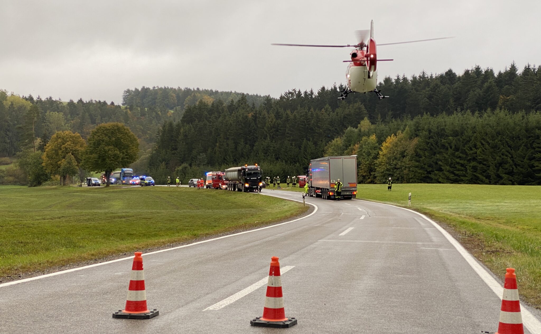 Die Kreisstraße musste gesperrt werden. Da der Lkw nicht mehr fahrbereit ist, wird die Sperrung noch einige Zeit in Anspruch nehmen.