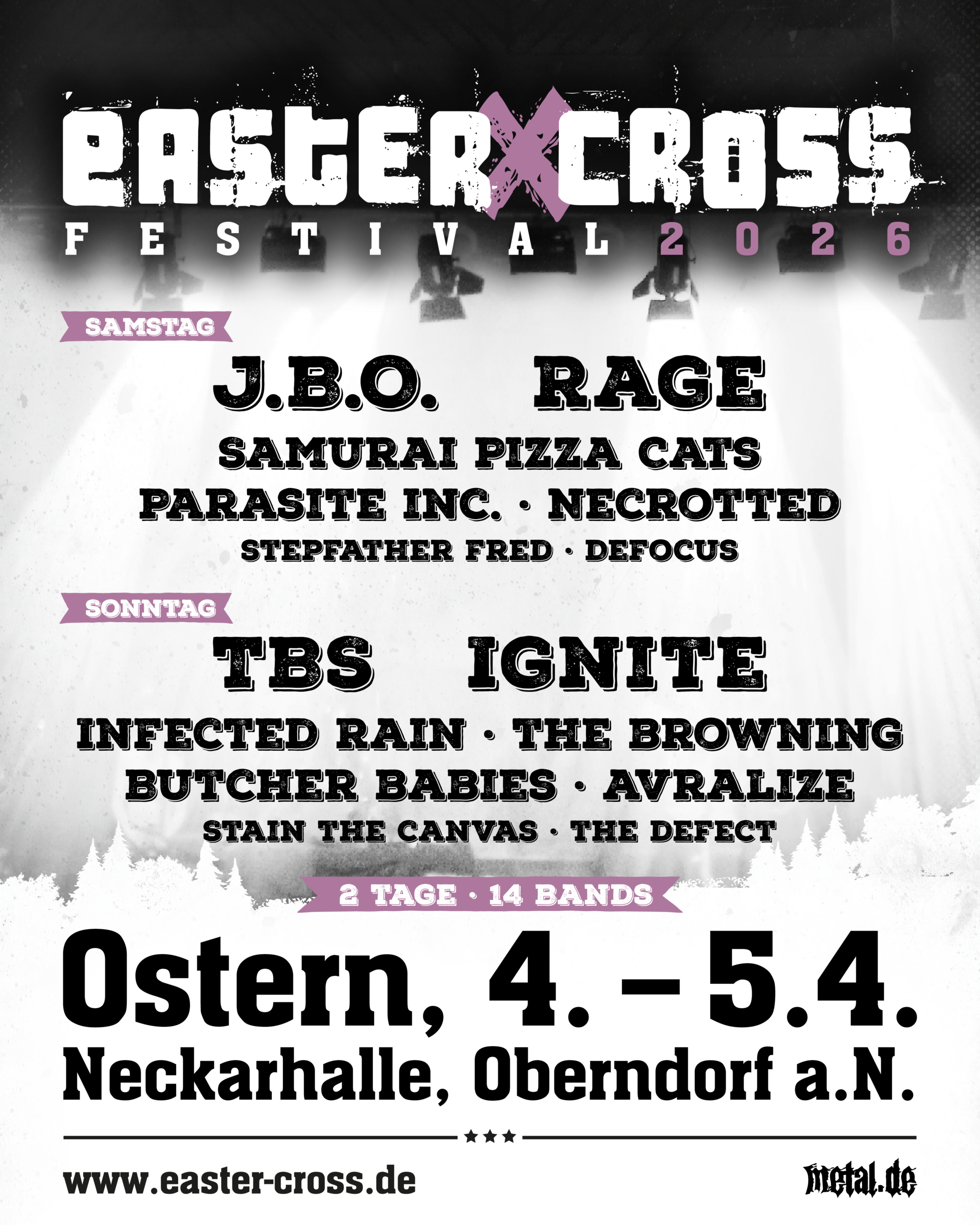 An zwei Tagen treten insgesamt 15 Bands auf – von etablierten Namen der Szene bis zu aufstrebenden Acts. Den Auftakt am Ostersamstag machen unter anderem JBO, Rage, Samurai Pizza Cats, Parasite Inc., Necrotted, Stepfather Fred und Defocus. Am Ostersonntag folgen unter anderem TBS, Ignite, Infected Rain, The Browning, Butcher Babies, Stain the Canvas und The Defect. Auch mit dabei: die regionalen Lokalmatadoren Avralize.