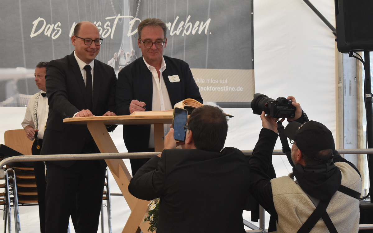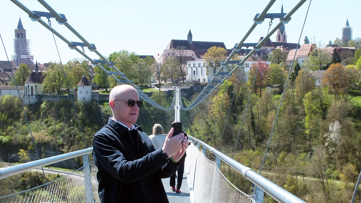 In dieser Zeit habe er auch Alfons Bürk kennen gelernt, den Architekten. Der habe die Idee eingebracht, eine Verbindung zwischen Innenstadt und Aufzugsturm herzustellen. Die Ideen, eine Seilbahn oder eine Zipline zu bauen, wurden verworfen. Dann folgte die Idee einer Hängebrücke. Die rechnete er Roland Haag zu. Beifall vom Publikum für beide.