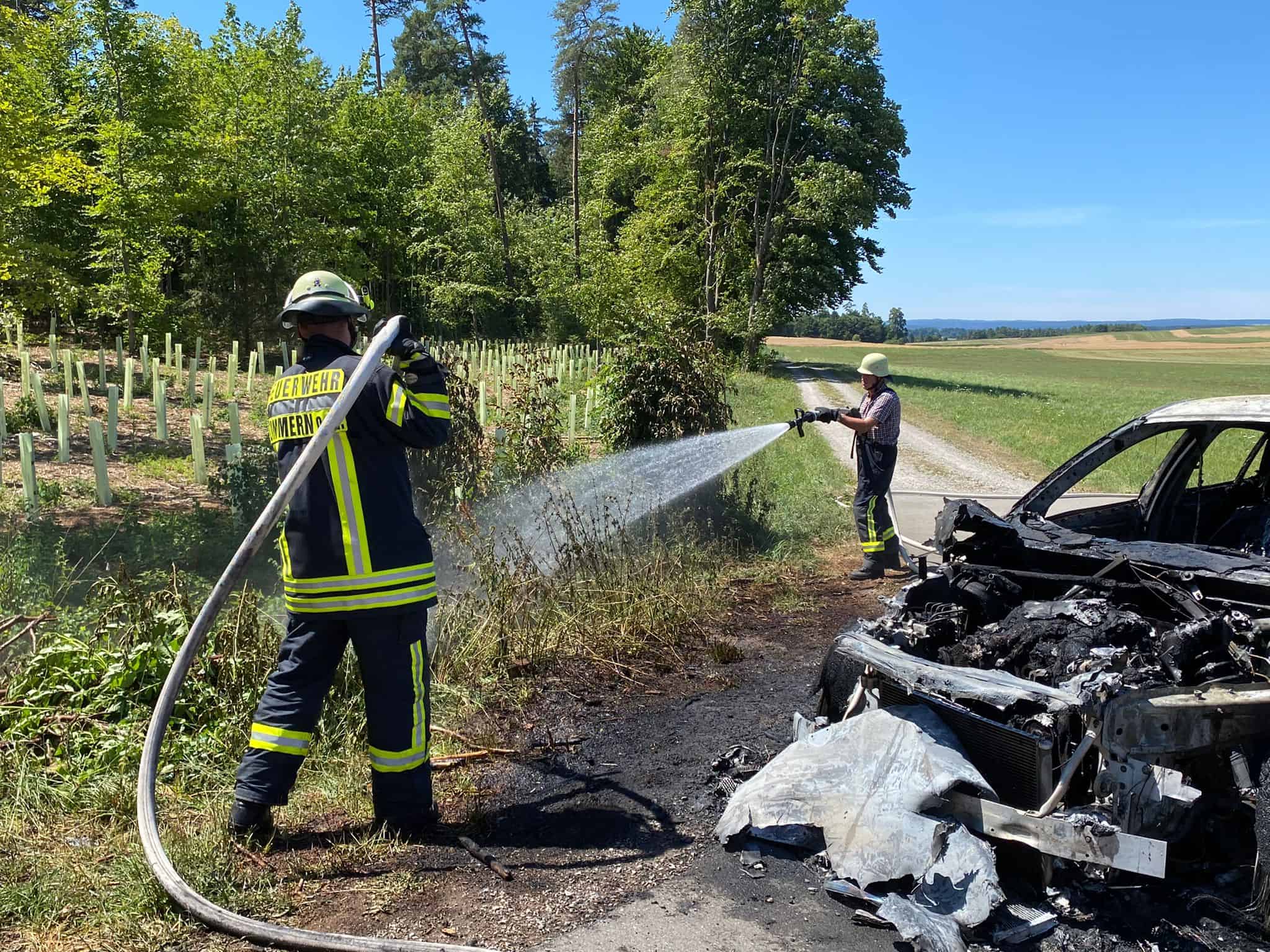 Die Feuerwehr Zimmern rückte mit zehn Einsatzkräften und vier Fahrzeugen an. Zur Unterstützung wurde die Feuerwehr Rottweil mit einem Tank-Löschfahrzeug hinzu alarmiert. Die Besatzung hatte die Aufgabe, die Ungebung des ausgebrannten Wagens zu wässern, um einen möglichen Waldbrand zu verhindern.