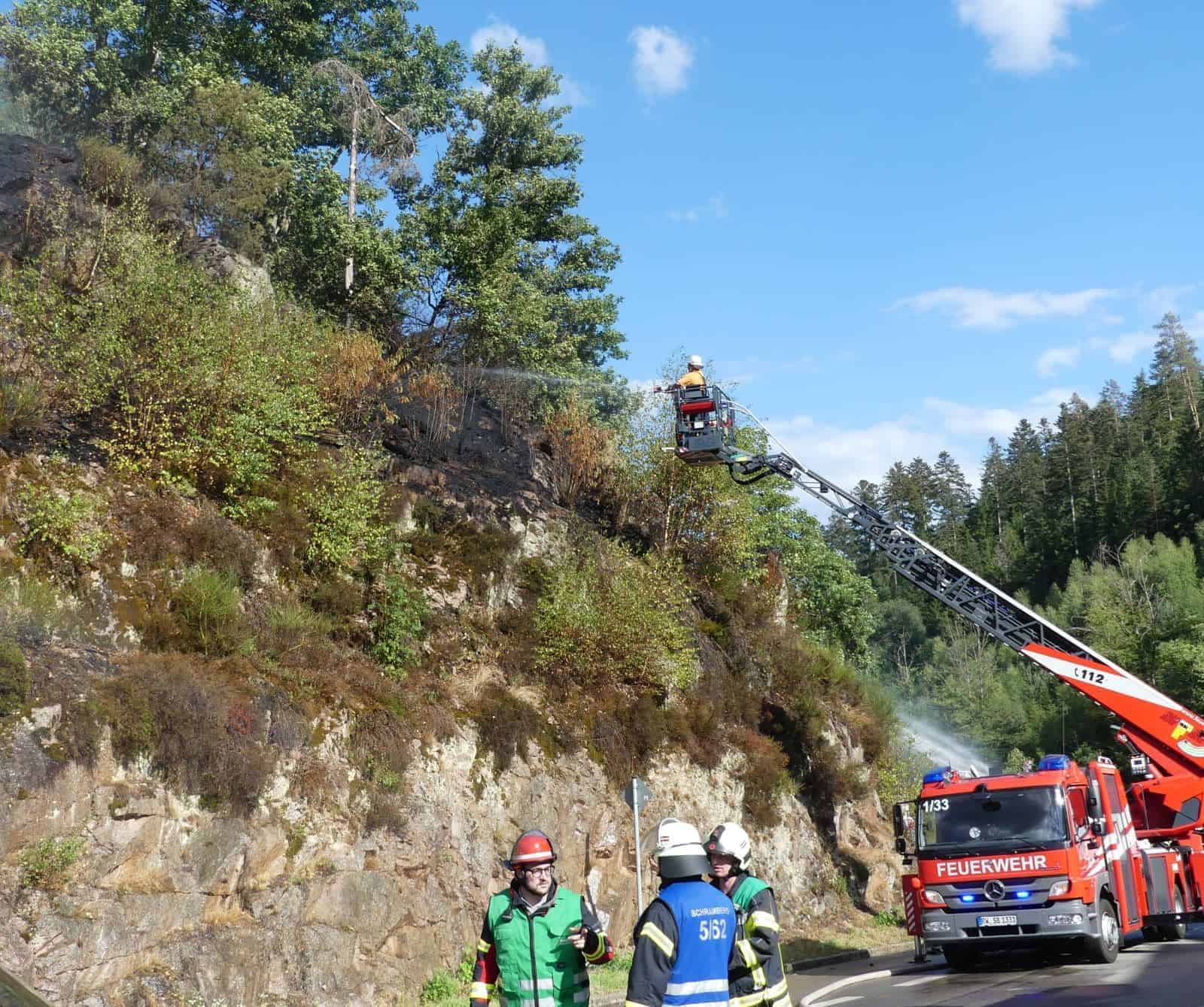 Bernd Haas, Kommandant der Lauterbacher Feuerwehr war zufällig vorbeigekommen und hat die Flammen entdeckt: „Ich bin sofort ins Gerätehaus und mit drei Kameraden und dem Tankfahrzeug losgefahren.“ Das Feuer habe sich unterhalb einer Sitzbank oben auf dem Felsen ausgebreitet. Sie hätten das auch schon fast gelöst gehabt, da habe der Wind die Flammen rechts nach hinten gezogen. Kurz darauf seien weitere Feuerwehrleute aus Lauterbach hinzugestoßen und sie hätten die linke Flanke eingedämmt. „Es hat sich schnell ausgebreitet.“