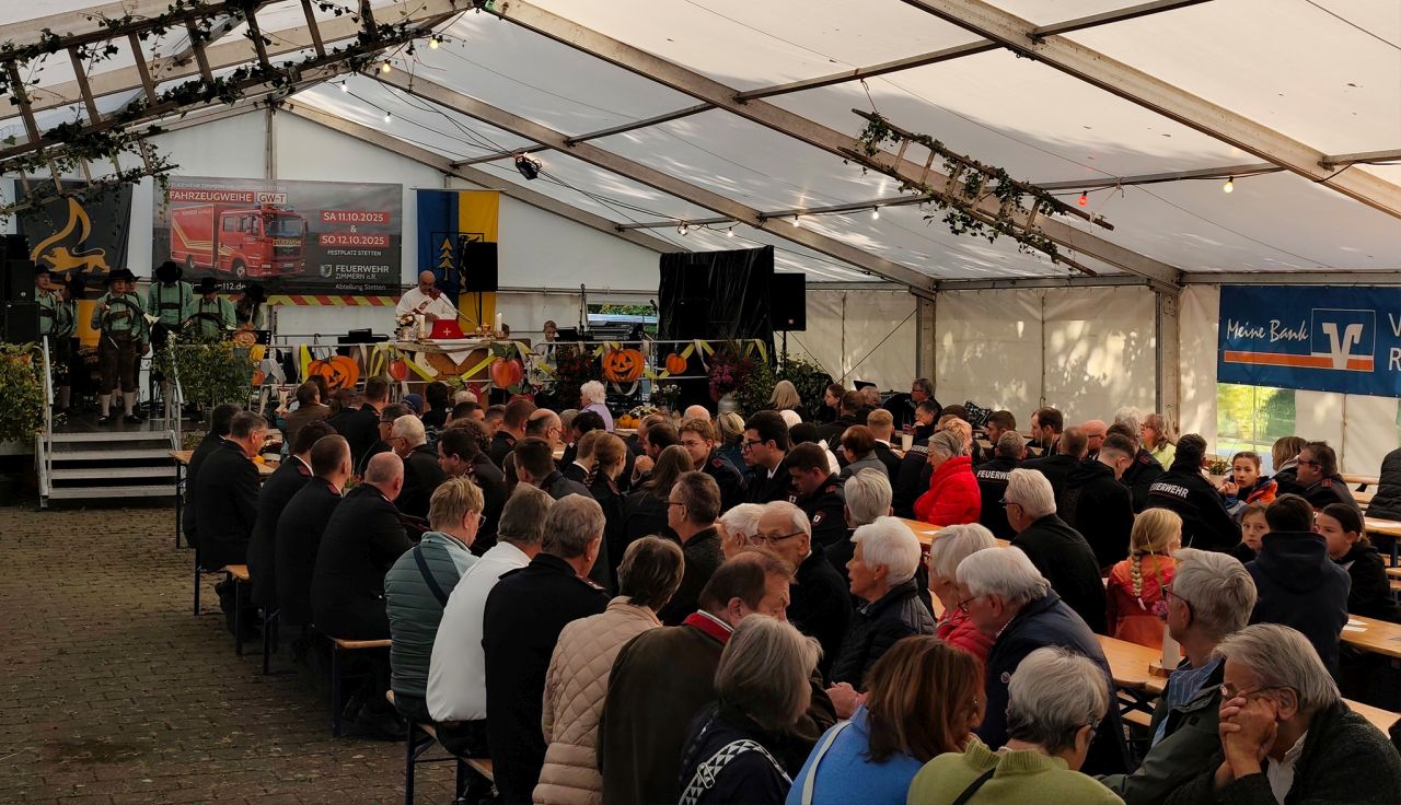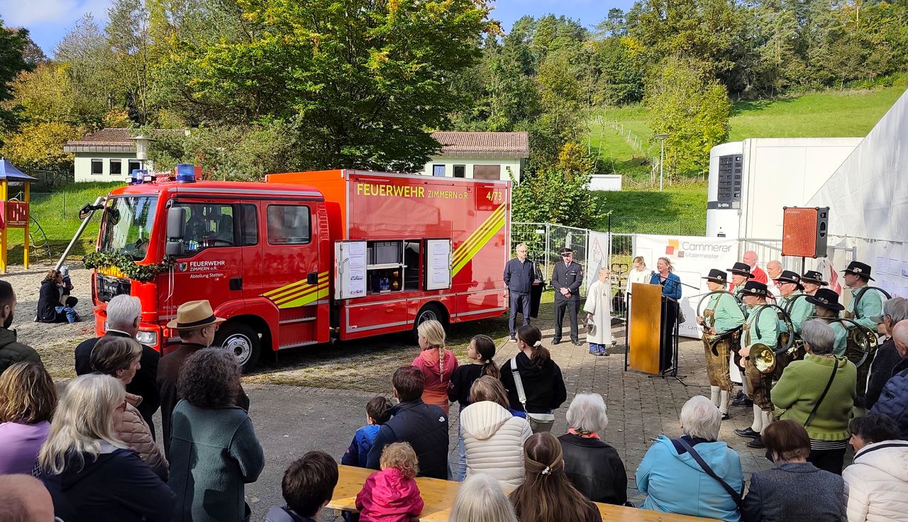 Festlicher Sonntag mit Weihe und Gottesdienst: Der Sonntag stand dann ganz im Zeichen der Fahrzeugweihe. Um 10 Uhr begann der feierliche Gottesdienst im Festzelt, musikalisch begleitet von der Parforcehorngruppe Rottweil. Im Anschluss wurde der neue Gerätewagen durch Pfarrer Josef Kreidler und Diakon Erwin Burkard offiziell gesegnet. Der neue GW-T trägt künftig den Funkrufnamen „Florian Zimmern 4/73“.