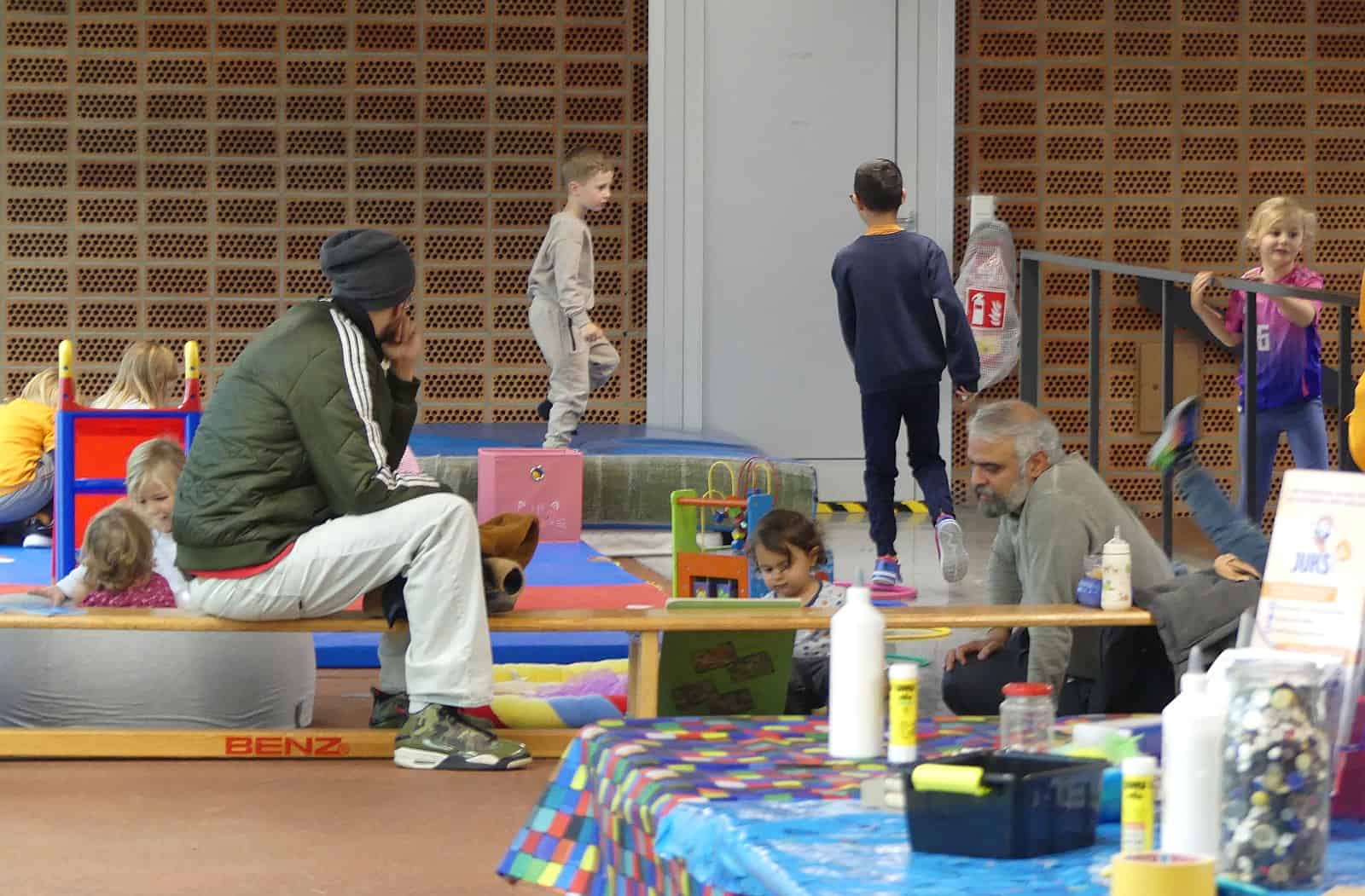 Auch die Eltern waren willkommen. Viele Mütter, aber auch Väter beteiligten sich beim Eltern-Kind-Turnen. Im Vorraum der Karl-Diehl-Halle drängelten sich die Kinderwagen.