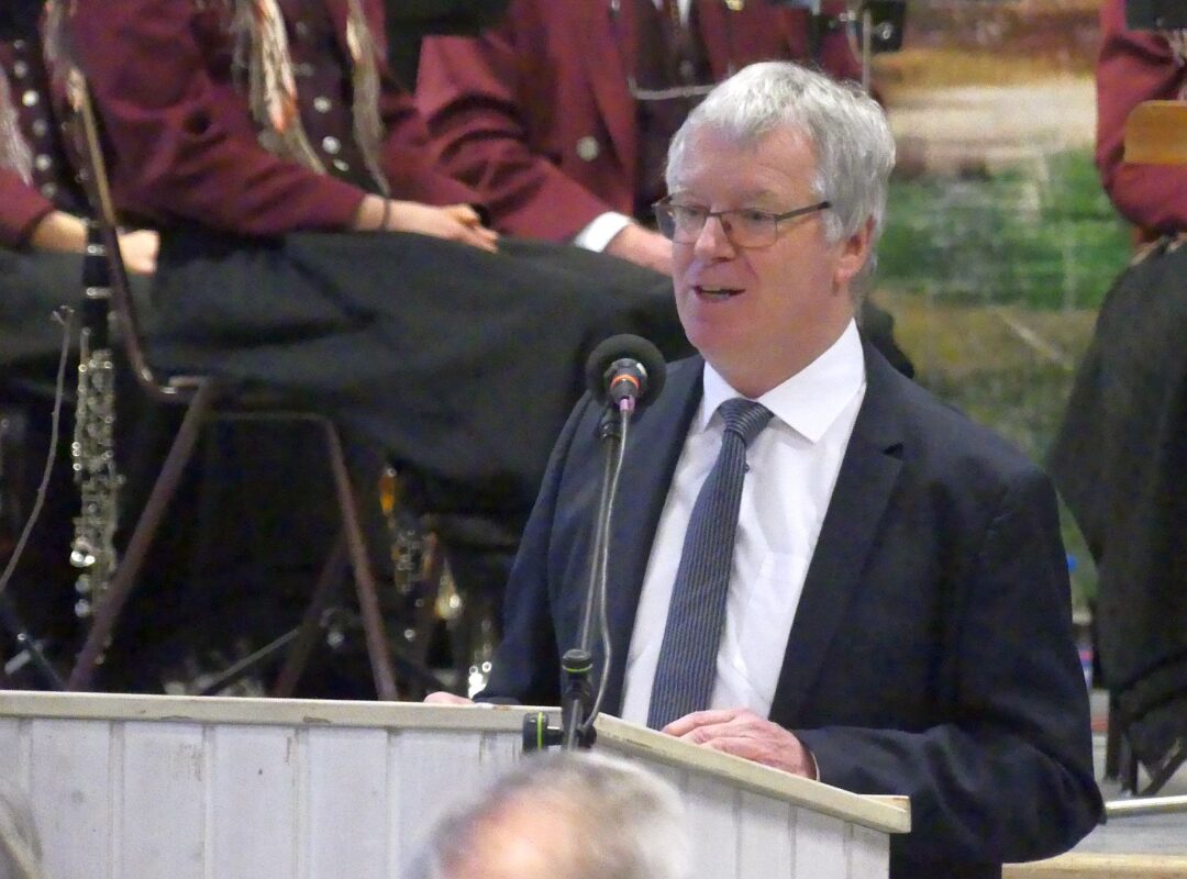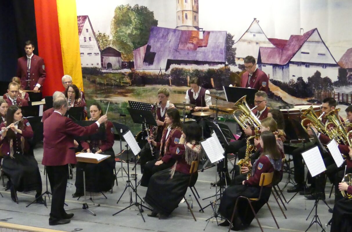 Moosmann dankte Zinell, der mit seiner Rede „den Nerv der Zeit“ getroffen habe, mit einem Weingeschenk. Auf der Bühne hatte inzwischen der Musikverein Locherhof Platz genommen. Unter der Leitung von Johannes Romer spielten die Musikerinnen und Musiker den – passenden – Marsch „Füreinander da“.