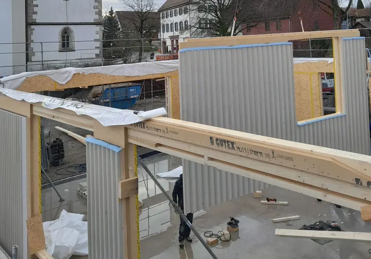 Nach Abschluss der Rohbauarbeiten und der Winterpause geht es nun mit großen Schritten am Neubau des katholischen Gemeindehauses in der Dietinger Ortsmitte weiter. In dieser Woche haben Zimmerleute mit dem Aufrichten der Wände und des Daches begonnen.