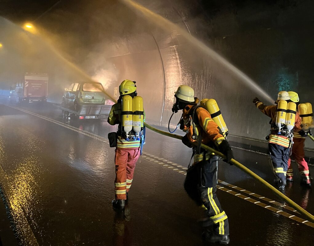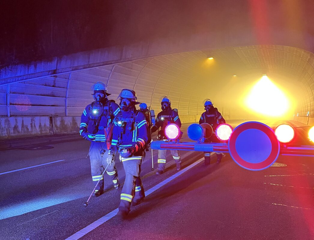 Auf der gegenüberliegenden Tunnelseite forderte eine zweite Station die Kräfte mit einem brennenden Kleinwagen. Neben dem Löscherfolg selbst spielten auch das Vorgehen und die Sicherheit eine wichtige Rolle: So muss in Tunnelröhren etwa die Tunneldecke über dem Brand gekühlt werden – damit wird verhindert, dass der Beton platzt und Trümmerteile auf die Einsatzkräfte stürzen.