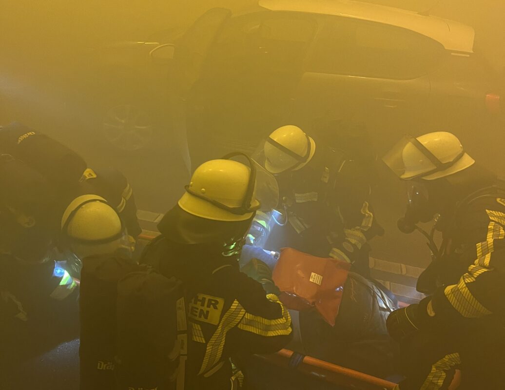Im Tunnel selbst warteten zwei anspruchsvolle Szenarien. Auf der einen Seite sorgte eine leistungsstarke Nebelmaschine für nahezu Nullsicht. Mehrere Fahrzeuge waren „verunfallt“, Verletzte lagen im Tunnel, ein Autofahrer hatte sich aus Panik sogar im Kofferraum verschanzt. Für die Atemschutzträger bedeutete das: keine Sicht, kaum Orientierung – und der Auftrag, alle Personen schnell und sicher nach draußen zu bringen. Suchstöcke halfen beim Abtasten des Bodens und der Fahrzeugunterseiten, da im dichten Rauch buchstäblich nichts mehr zu sehen war.