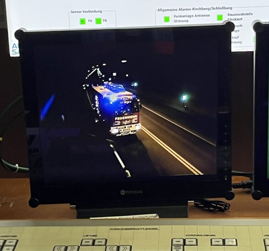 Begleitet wurde die Übung noch von anderer Seite, nämlich aus dem Tunnelbetriebsgebäude. Dort laufen alle technischen Informationen zusammen: Lüftung, Beleuchtung, Detektoren, Kameras und Notfallsysteme. Tunnel gehören zu den bestüberwachten Straßenabschnitten überhaupt; entsprechend wichtig ist es, dass nicht nur die Feuerwehren, sondern auch der Tunnelbetrieb selbst auf realistische Szenarien vorbereitet wird. Tunnelmeister Helmut Fauter und Mitarbeitende der Straßenmeisterei und des Straßenbauamtes behielten in der Zentrale im Blick, ob die Technik wie erwartet reagiert.