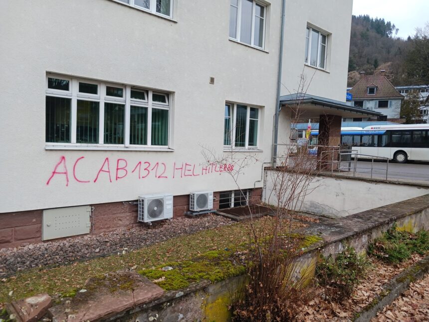 In Schramberg besprühte eine unbekannte Täterschaft am Samstagabend zwischen 18:50 und 19:00 Uhr die Fassade des Polizeireviers Schramberg sowie ein nahe geparktes Auto mit roter Farbe. Dabei entstanden mehrere Schriftzüge mit fremden- und polizeifeindlichen Parolen. Der geschätzte Sachschaden beträgt rund 10 000 Euro. Hinweise zur Täterschaft nimmt das Polizeirevier Schramberg entgegen.