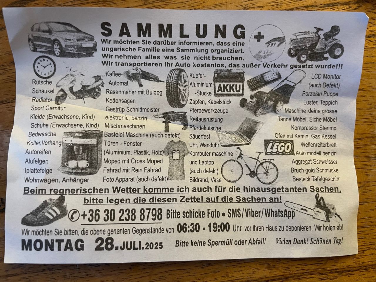 Derzeit werden in mehreren Städten und Gemeinden des Landkreises Rottweil wieder Flyer verteilt, mit denen eine sogenannte „Sammlung“ durch eine ungarische Familie angekündigt wird. Die Zettel versprechen die kostenlose Abholung unterschiedlichster Gegenstände – von Autoreifen über Elektrogeräte bis hin zu abgemeldeten Fahrzeugen.