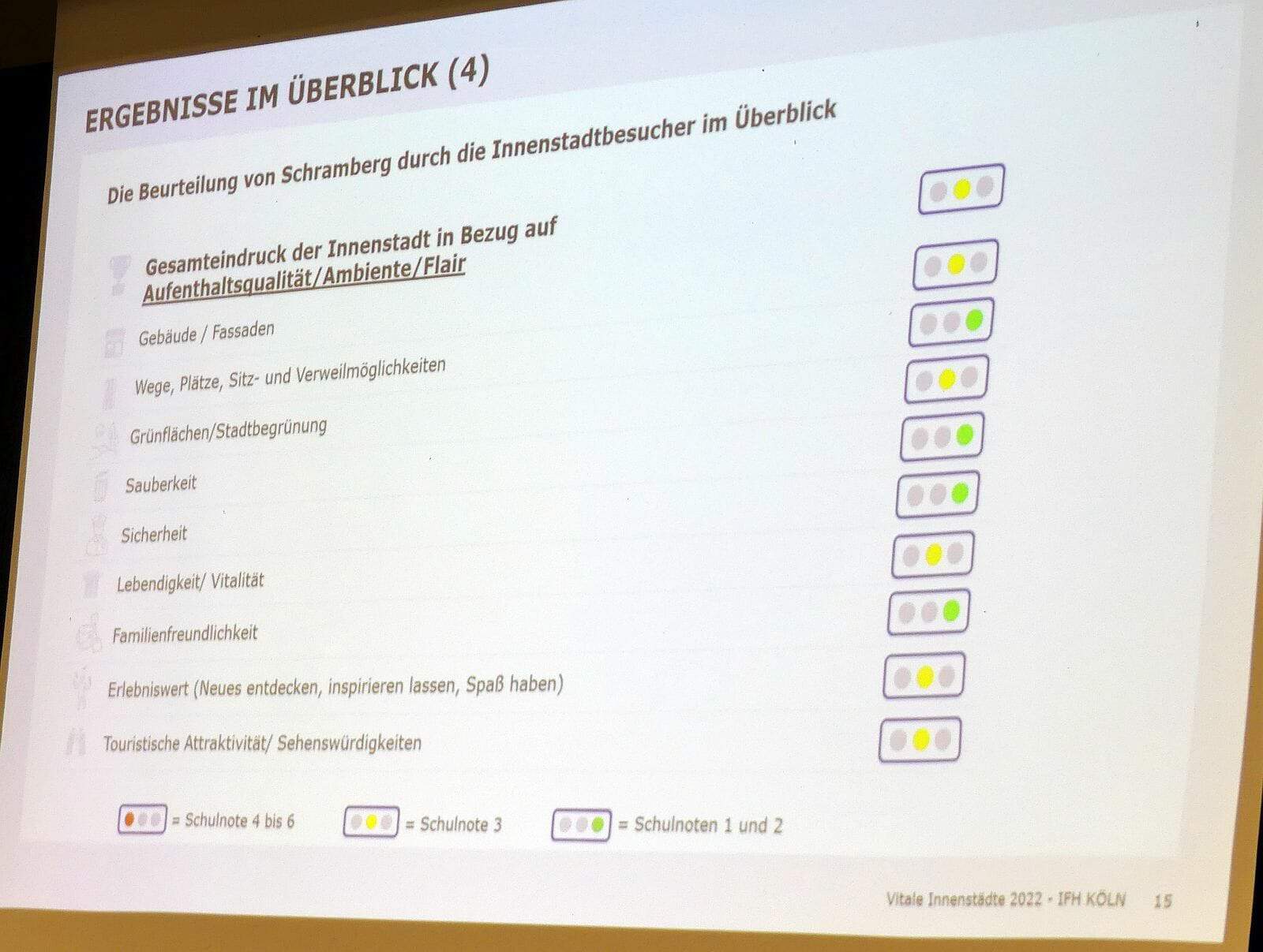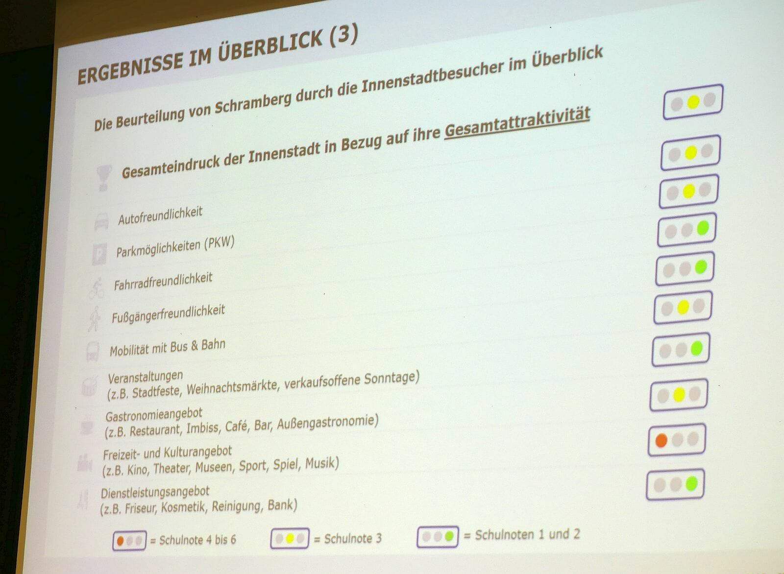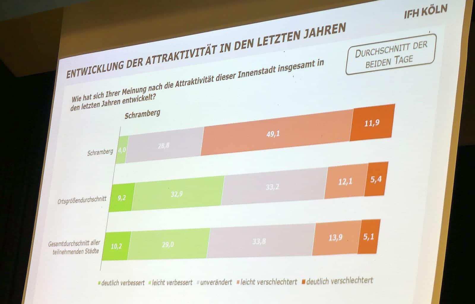 Insgesamt nahmen 111 Städte und Gemeinden in Deutschland teil, 18 Städte davon sind in vergleichbarer Größe zu Schramberg. Befragungsorte und Zeiten waren in Schramberg an Donnerstagen am Rathaus, am Hirsoner Platz und auf dem Sulgen und an Samstagen auf dem Wochenmarkt. Themen der Befragung waren die Herkunft der Passanten, die Attraktivität der Innenstadt, Besuchsgründe, Mobilitätsverhalten, Einzelhandelsbesatz, Einkaufs- und Freizeitverhalten.
