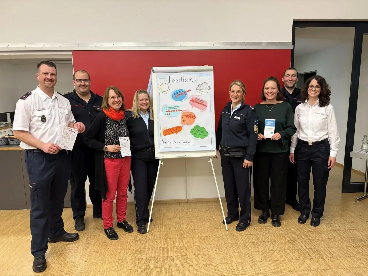 Die Vertreter der Kreisjugendfeuerwehr Andreas Roth und Sina Ulmschneider stellten zusammen mit Tanja Kaluza-Rall und Maren Hagel des Polizeipräsidiums Konstanz und mit Renate Weiler und Sarah Link von Freuen helfen Frauen – Auswege e.V. zunächst anhand dreier Fallbeispiele mögliche Verdachtsfälle samt möglichen Handlungsempfehlungen vor. Anschließend wurde mit einem Flyer auf die Handlungsempfehlung der Kreisjugendfeuerwehr eingegangen.