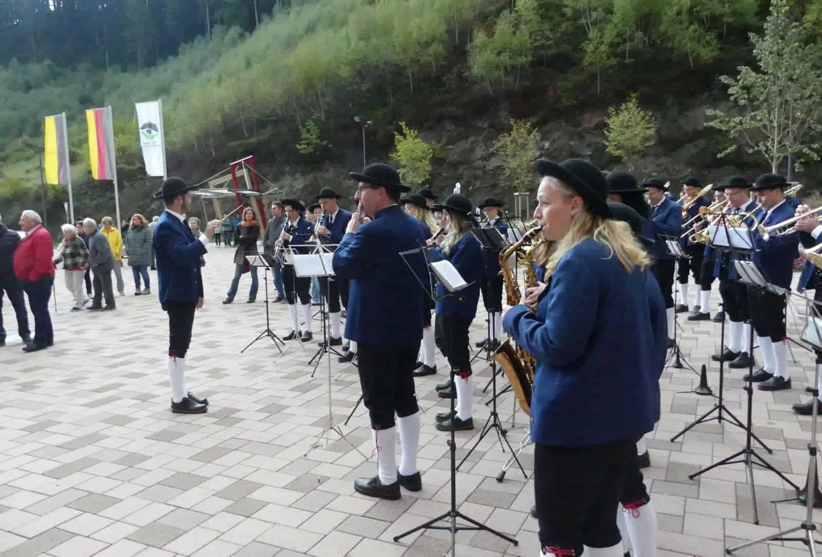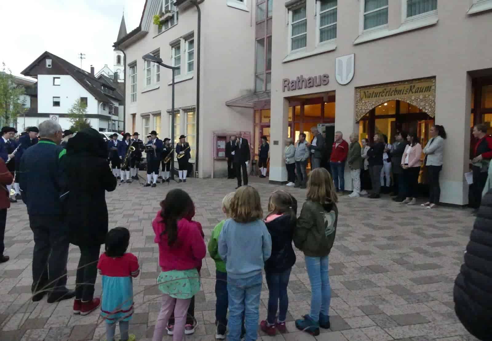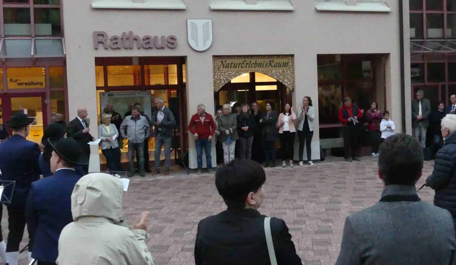 Als dann alles passte, trat Bürgermeister Norbert Swoboda vor das Rathaus – und ein ordentlicher Platschregen kam vom Himmel. Die Musikerinnen und Musiker vom Musikverein Eintracht Lauterbach ließen sich aber nicht beirren und spielten munter drauf los.