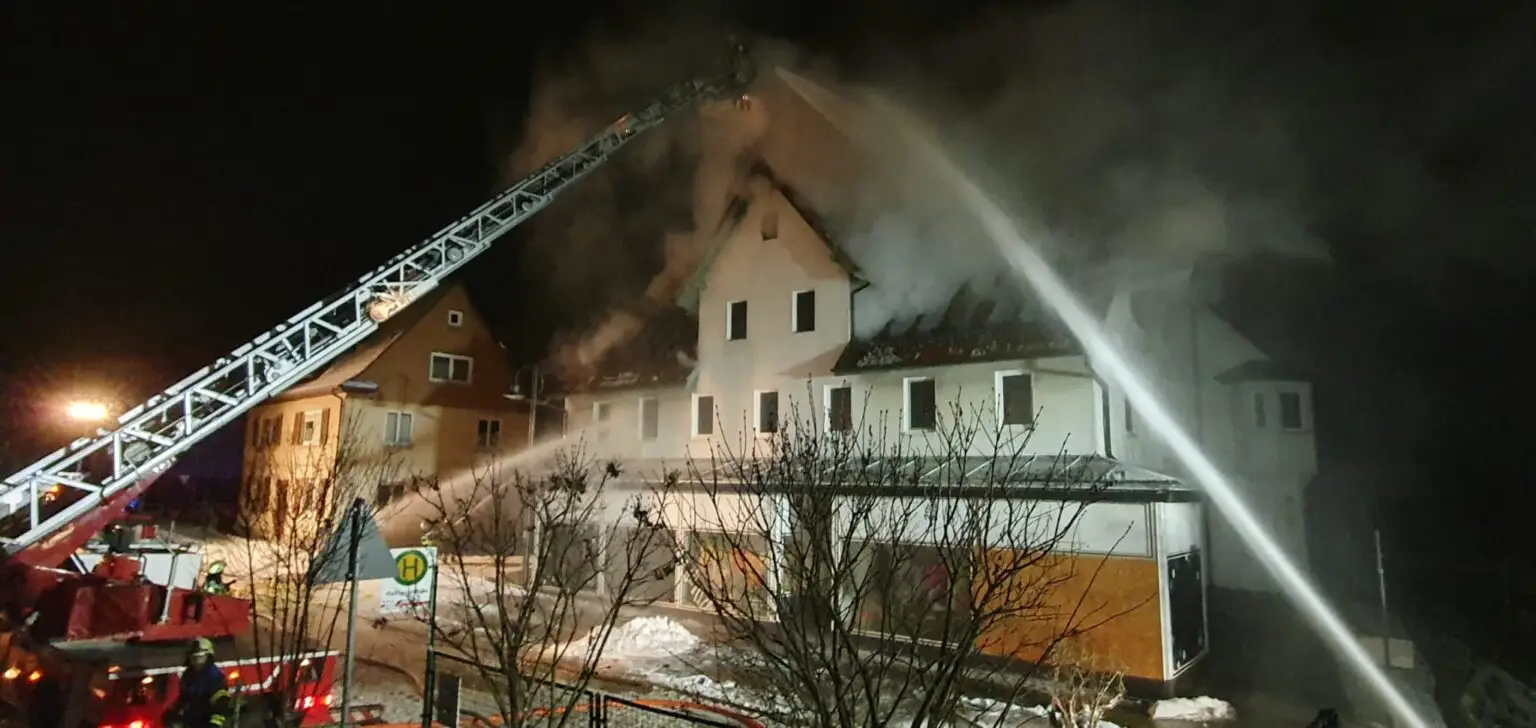Zur effektiven Brandbekämpfung kam zudem die Drehleiter der Feuerwehr Fluorn-Winzeln zum Einsatz, über die die Löscharbeiten von oben durchgeführt wurden. Die Löschmaßnahmen erfolgten überwiegend von außen, um eine weitere Ausbreitung des Feuers zu verhindern. Zum Zeitpunkt der Berichterstellung dauerten die Löscharbeiten noch an und werden voraussichtlich bis in die frühen Morgenstunden fortgesetzt.