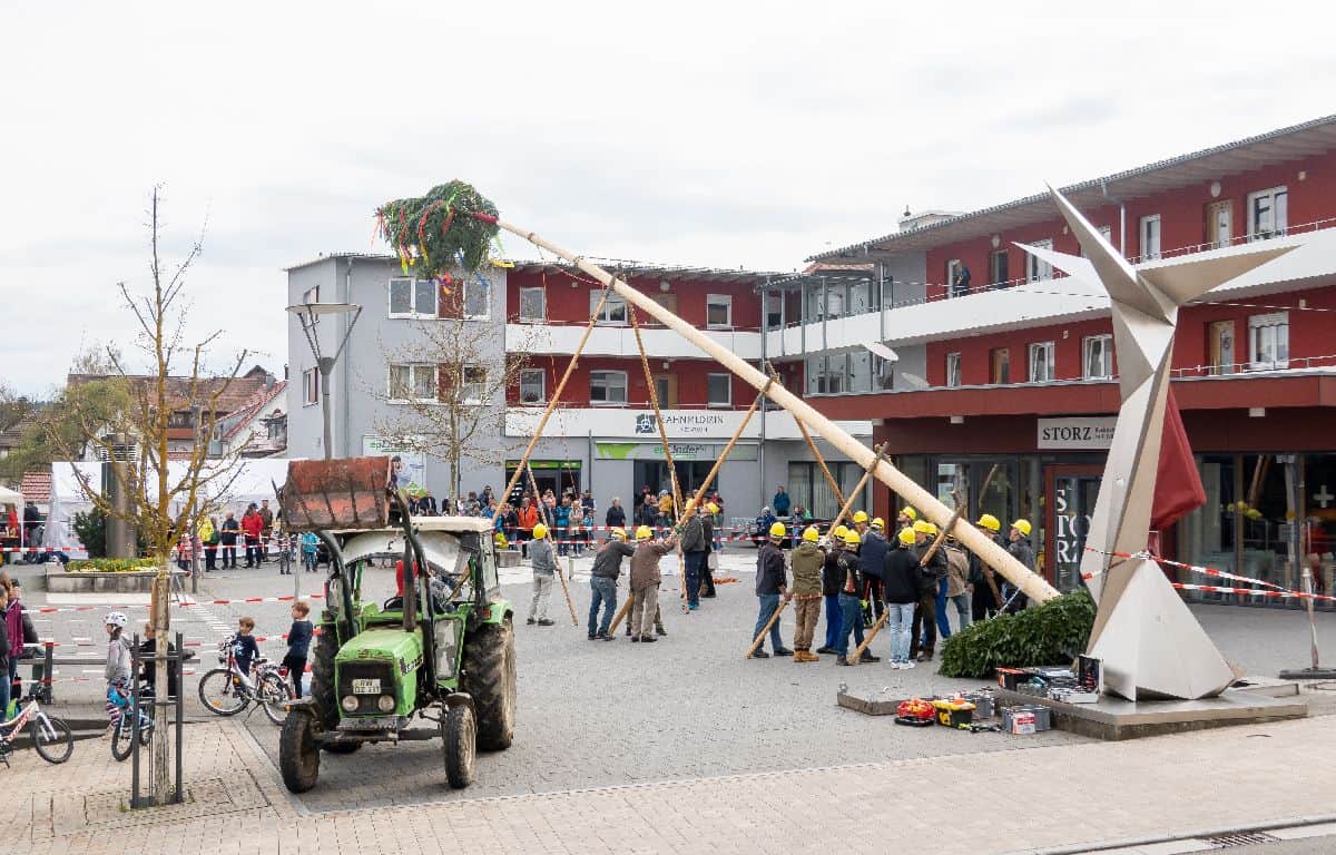 Traditionsgemäß stellt die Kolpingsfamilie den mit einem Kranz und mit Handwerkersymbolen geschmückten Baum mit Muskelkraft in der Ortsmitte auf. Bei den Handwerkersymbolen fand heuer ein Austausch statt – der Buchdruck (ehemals Rapp) wurde ersetzt durch den aktuellen Goldschmied (Franke). Das Setzen des Maibaums scheint germanischen Ursprungs zu sein.