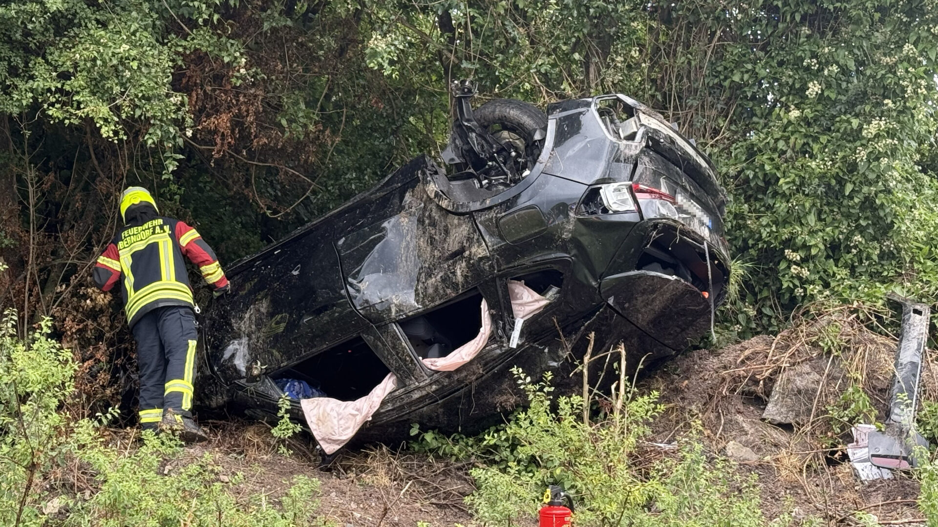 - Und der 14.07.2025: An diesem Tag kommt ein weiterer BMW X3 an dieser Stelle von der Fahrbahn ab. Die Einsatzkräfte fanden nur noch ein Wrack vor. Der Wagen hatte die Fahrbahn verlassen, rechts einen Wildschutzzaun überquert und ist dann völlig demoliert und kopfüber an einem Baum liegen geblieben. Eines der Räder wurde dabei abgerissen. Der Wagen hatte sich laut Polizei mehrfach überschlagen. Glücklicherweise war der Fahrer nach diesem Unfall „wach und ansprechbar“, wie der Einsatzleiter der Feuerwehr damals der NRWZ sagte.