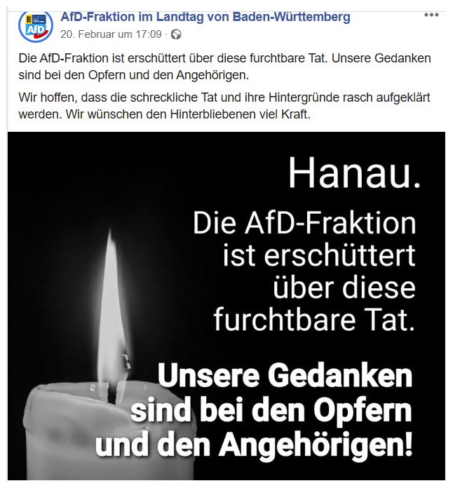 Sänze antwortet mit einem Facebookausschnitt der AfD-Landtagsfraktion vom 20. Februar. Darin zeigt sich die AfD-Fraktion „erschüttert über diese furchtbare Tat“ und hoffe, dass die Hintergründe rasch aufgeklärt würden. „Unsere Gedanken sind bei den Opfern und den Angehörigen!“