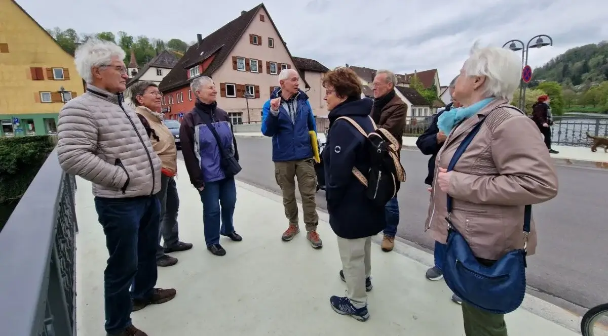 Für Naturfreunde gibt‘ kein schlechtes Wetter, und so trotzte, angeführt von der Vorsitzenden Gisela Burger, eine kleine Delegation aus Rottweil dem kalten Wind und den dräuenden Wolken und ließ sich von Klaus Schätzle „auf den Spuren der Sozialdemokratie“ durch Sulz führen.