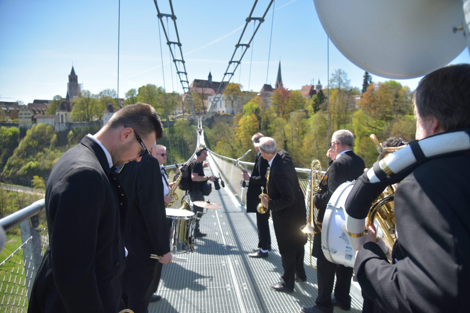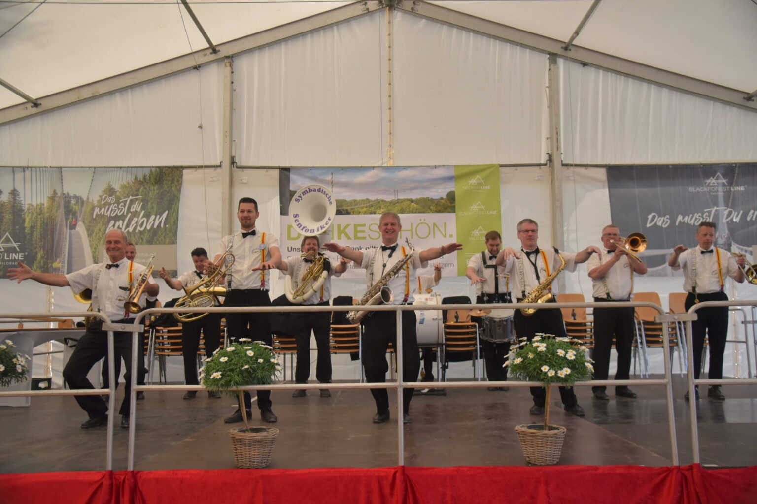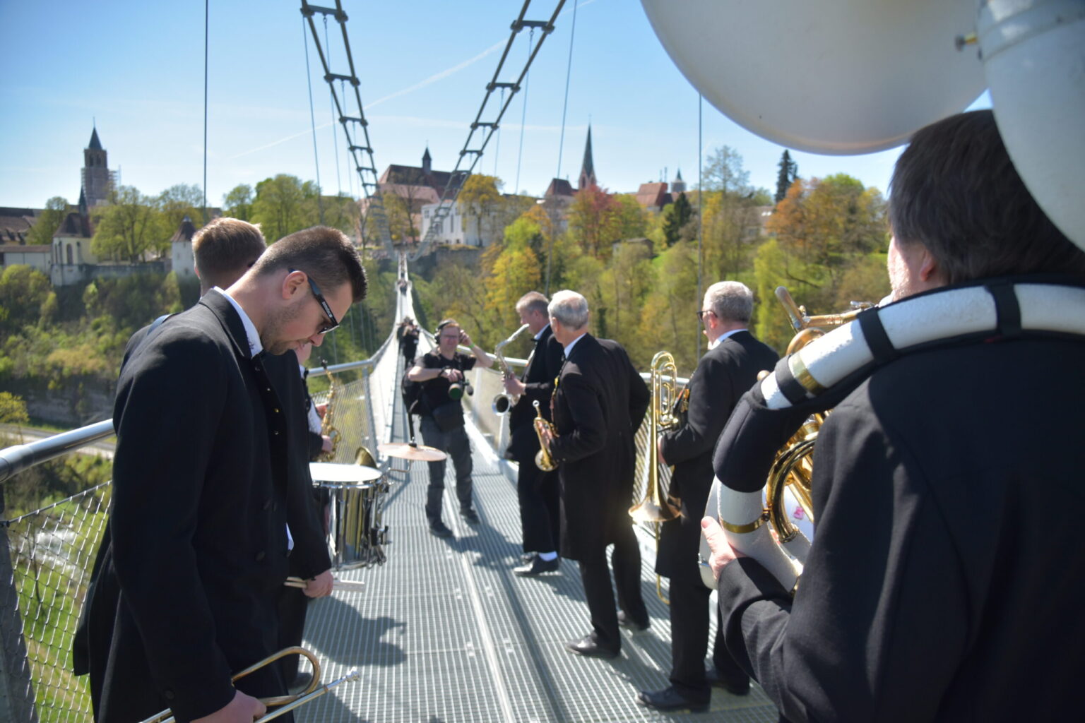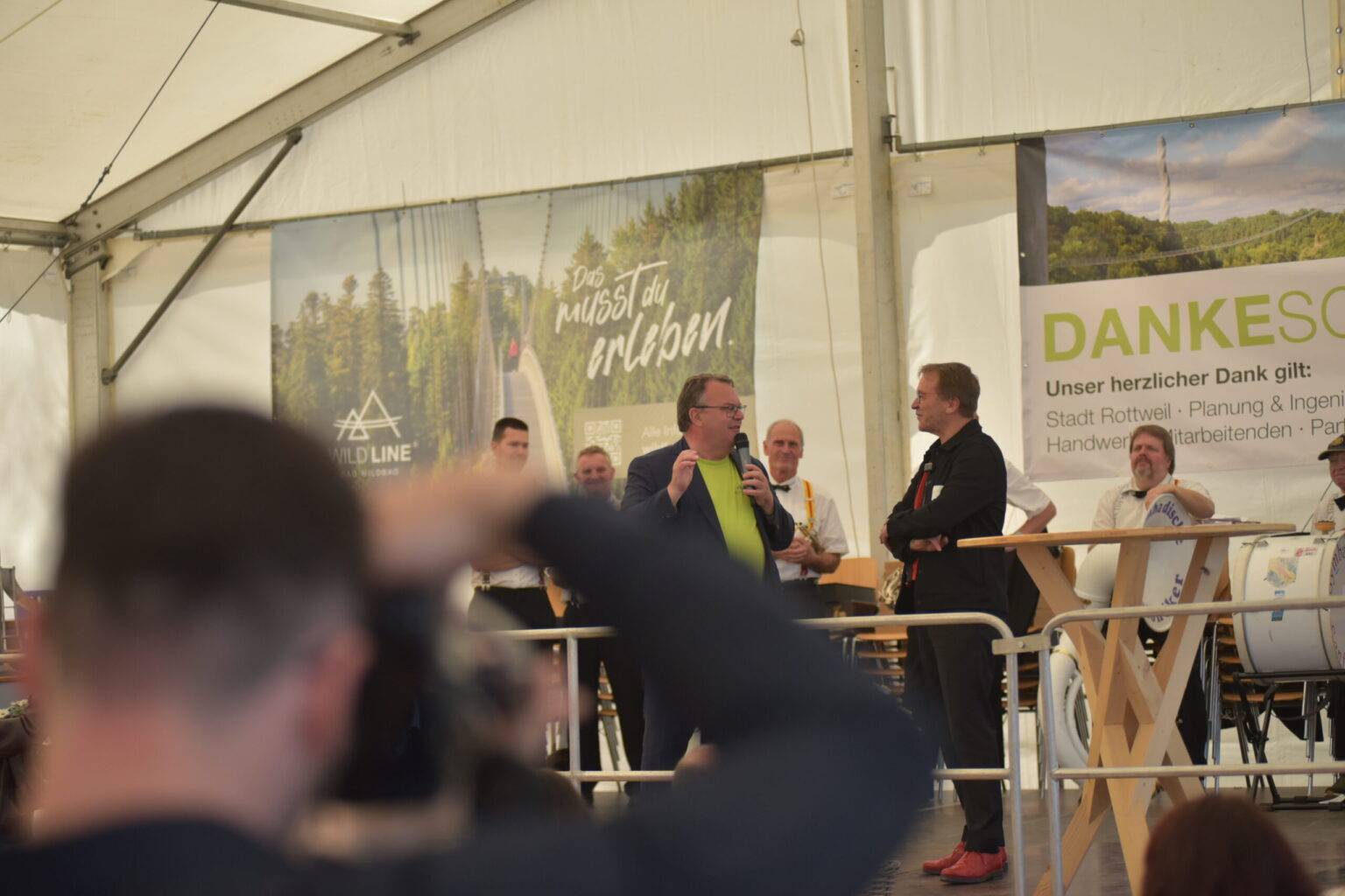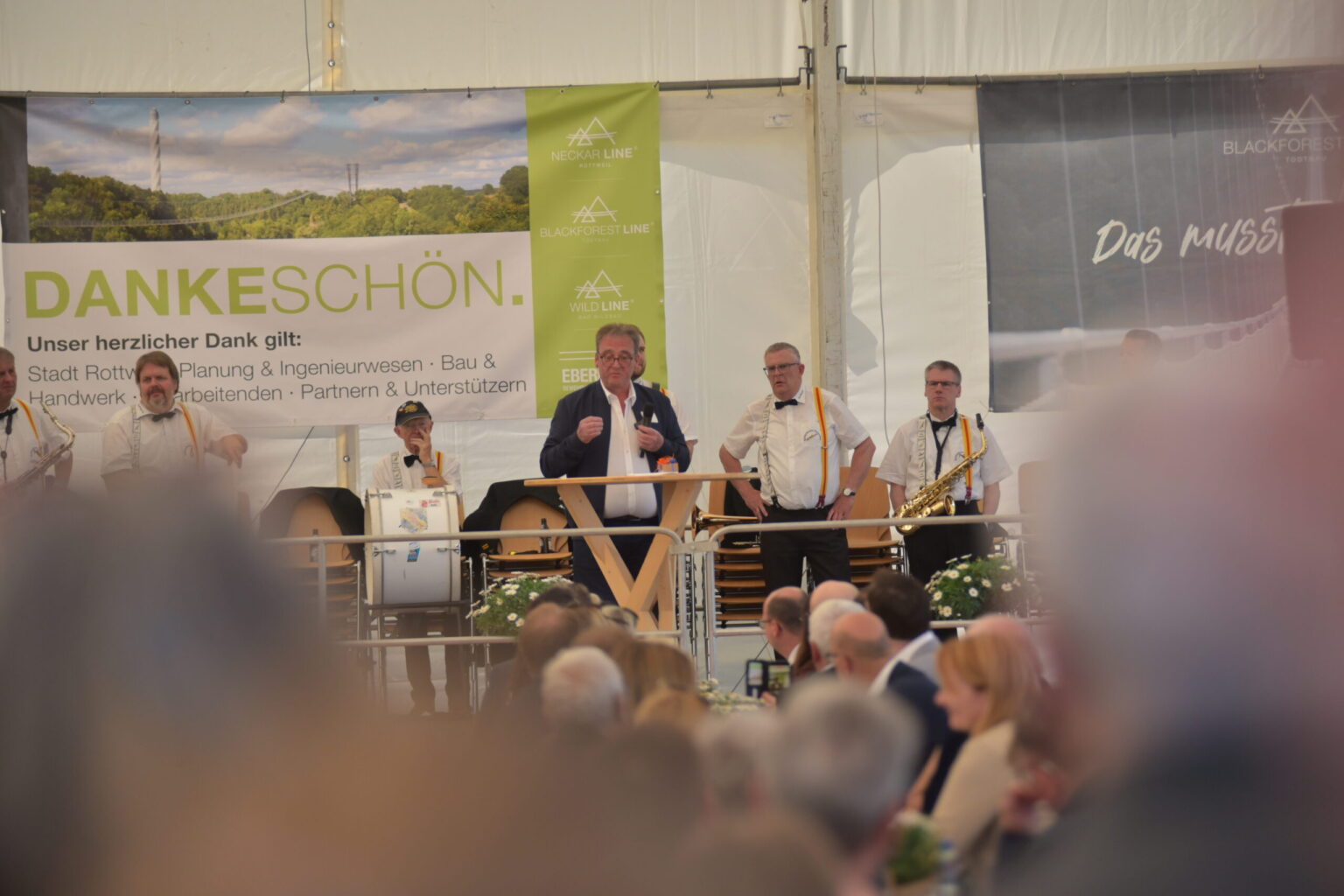Rottweil – Im Festzelt am Besucherzentrum begann das Programm um 10.30 Uhr – zünftig und schmissig eingeleitet von den „Symbadischen Senfonikern“. Vips und Promis waren angekündigt, es fand sich dann neben Oberbürgermeister Dr. Christian Ruf wohl so weitgehend alles ein, was in der Region Rang und Namen und einen gewissen Bekanntheitsgrad hat. Höhepunkt war der symbolische Banddurchschnitt, mit dem die Brücke offiziell eröffnet wurde und über den wir gesondert berichten.