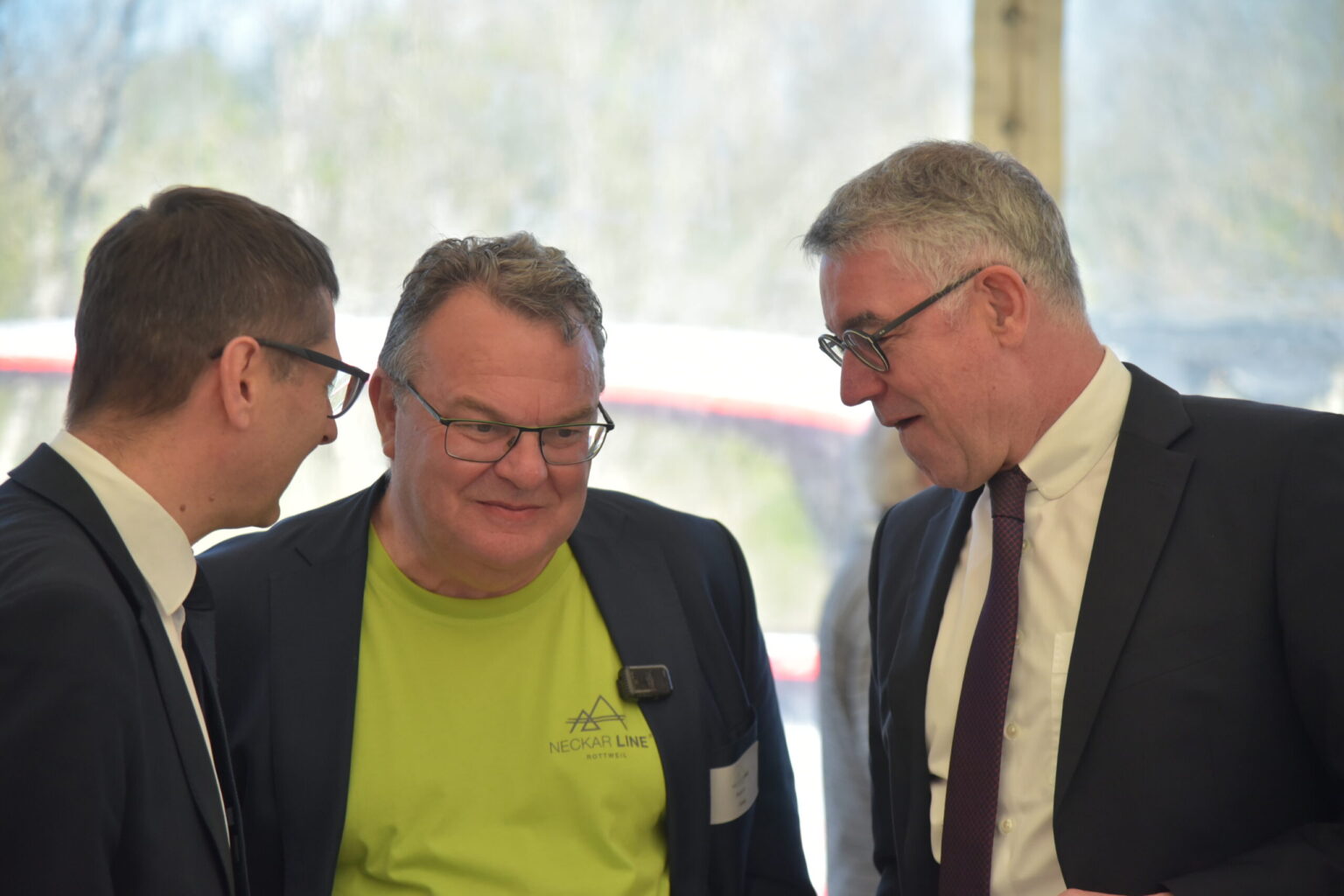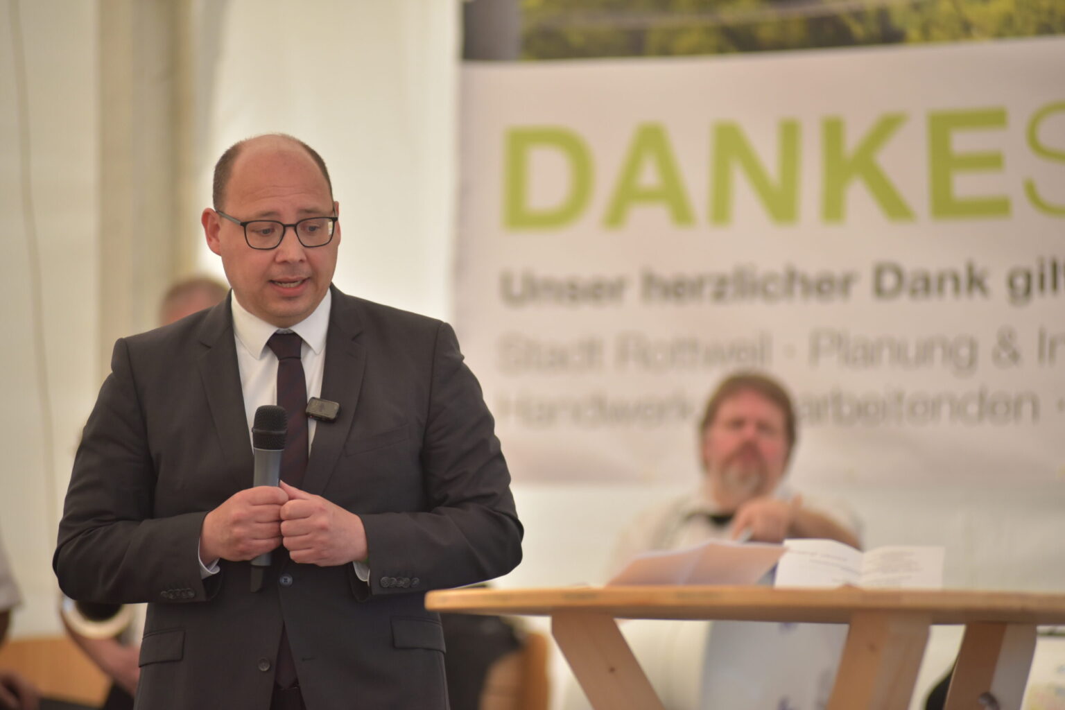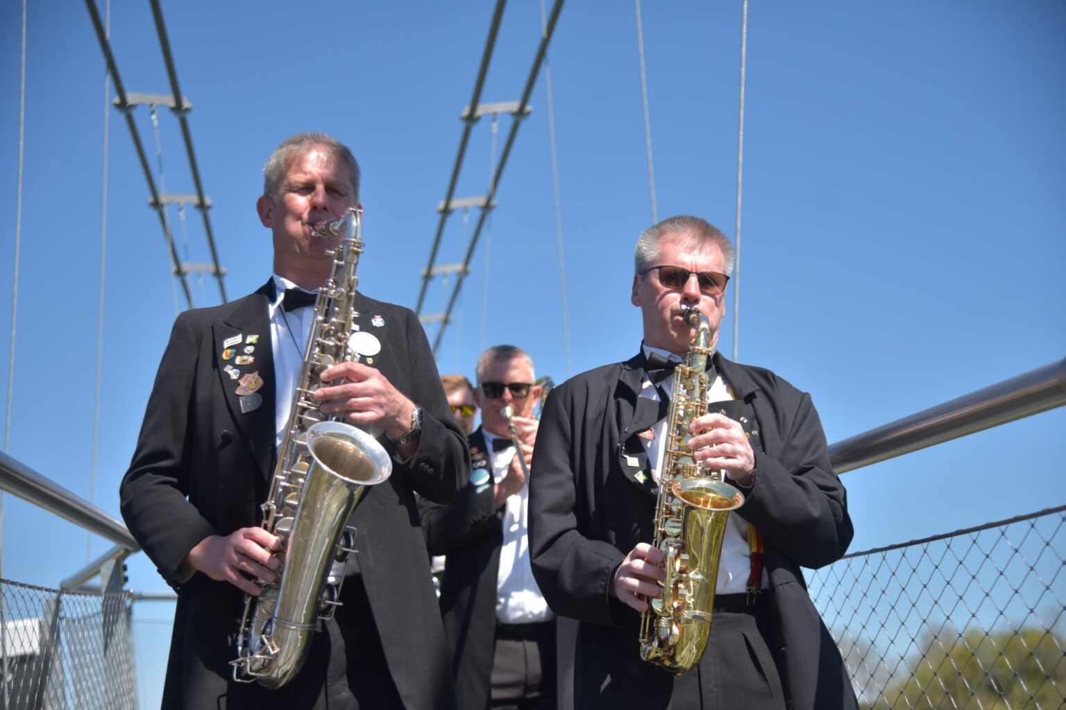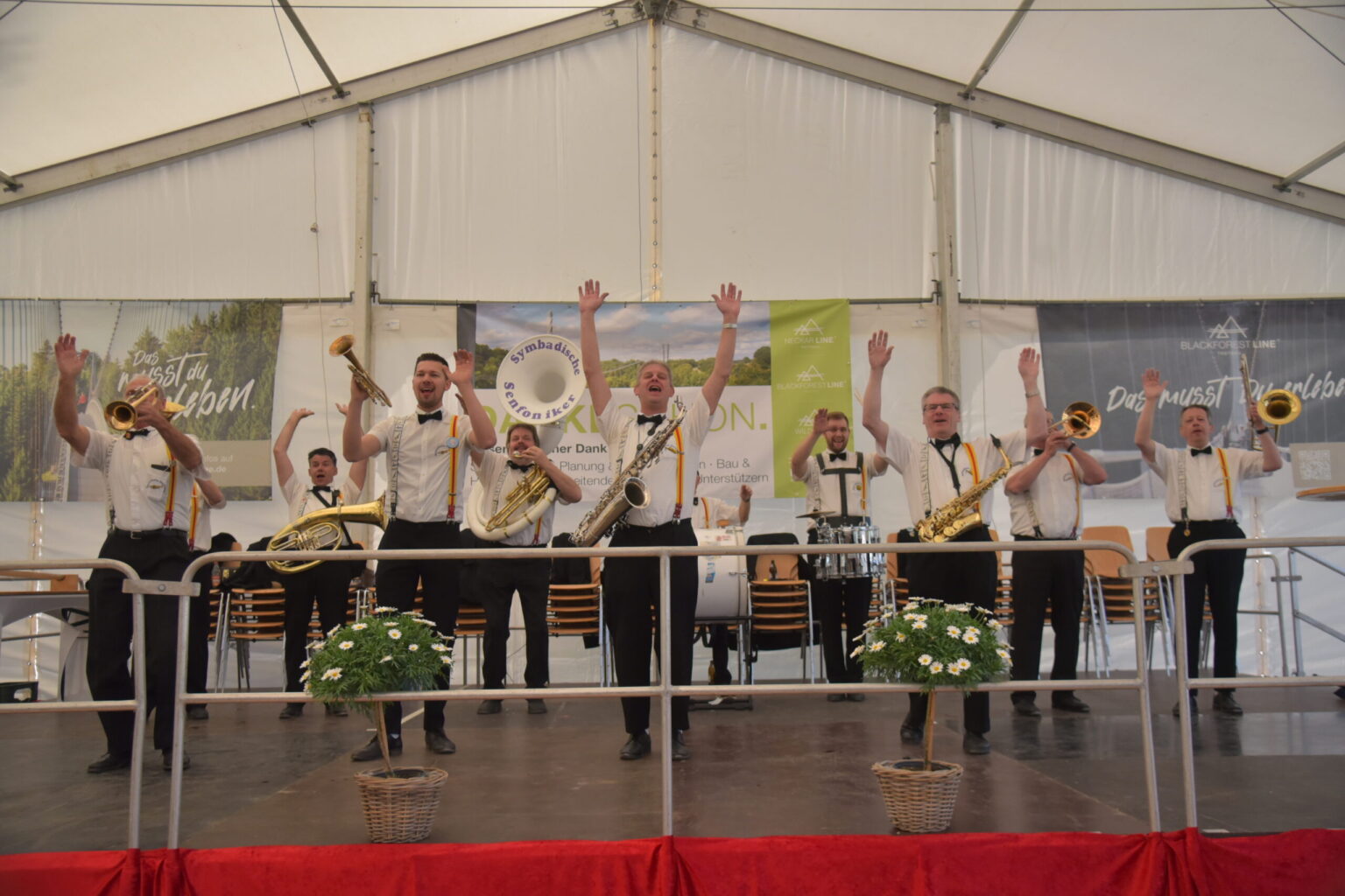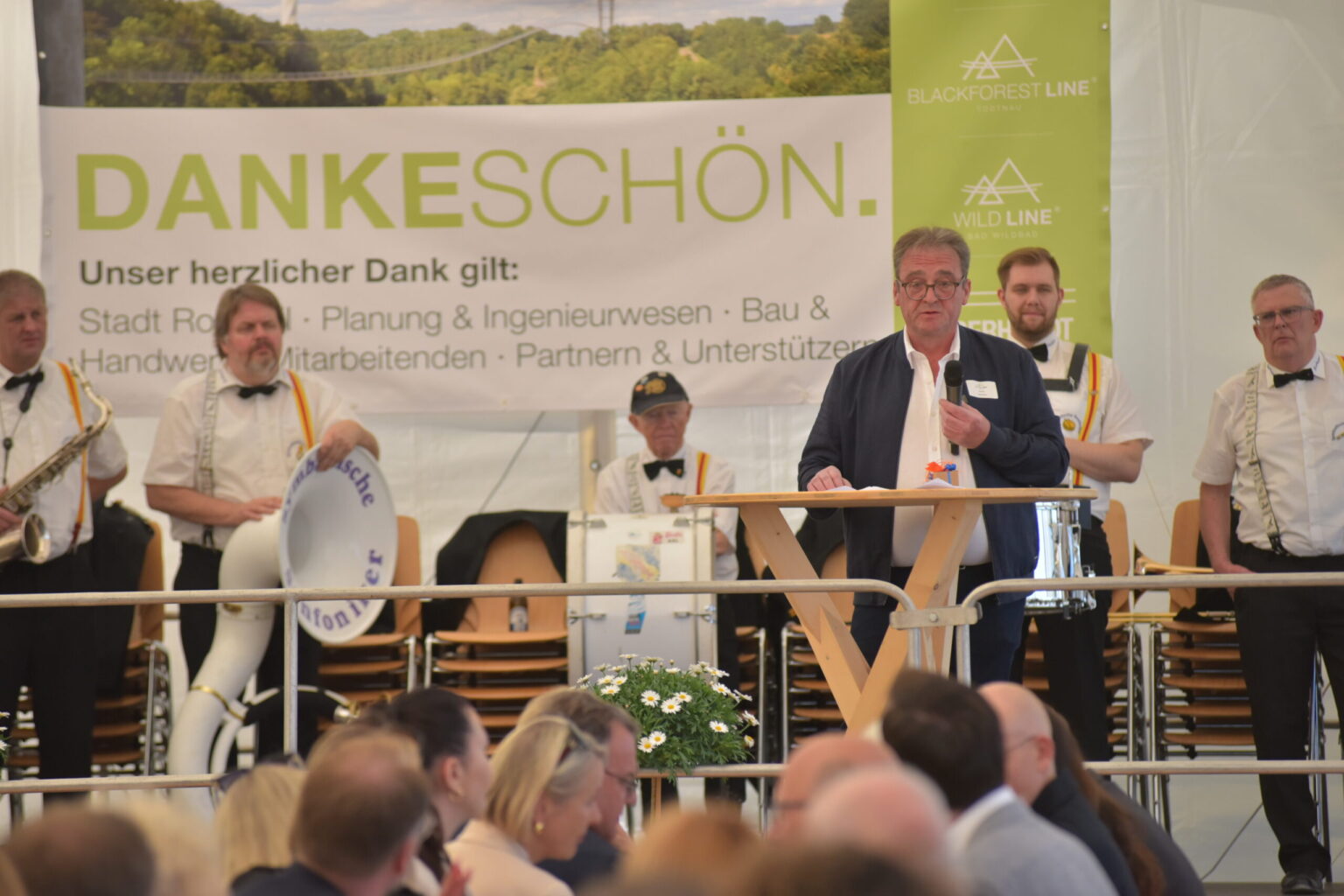 Rottweil – Im Festzelt am Besucherzentrum begann das Programm um 10.30 Uhr – zünftig und schmissig eingeleitet von den „Symbadischen Senfonikern“. Vips und Promis waren angekündigt, es fand sich dann neben Oberbürgermeister Dr. Christian Ruf wohl so weitgehend alles ein, was in der Region Rang und Namen und einen gewissen Bekanntheitsgrad hat. Höhepunkt war der symbolische Banddurchschnitt, mit dem die Brücke offiziell eröffnet wurde und über den wir gesondert berichten.
