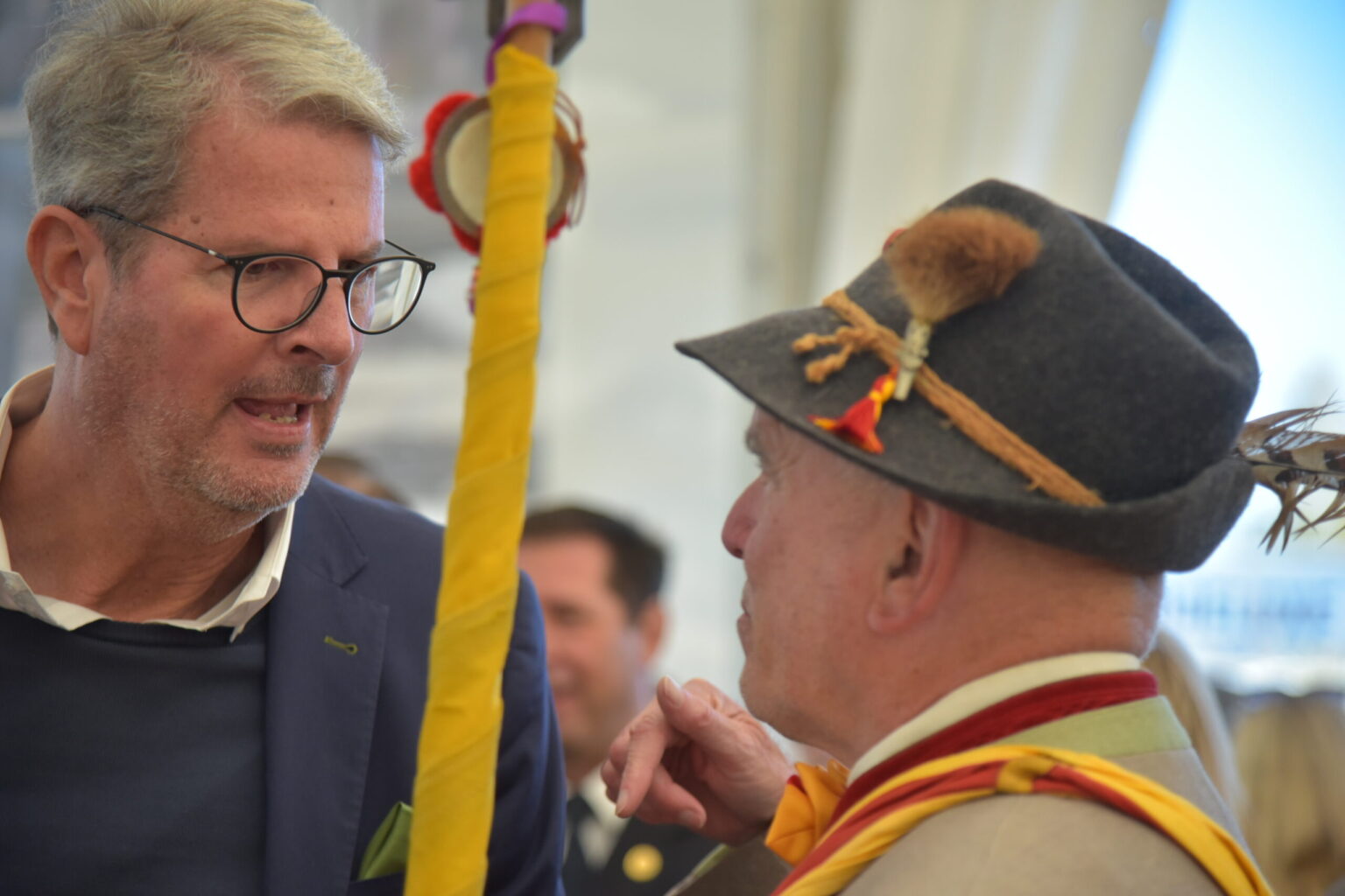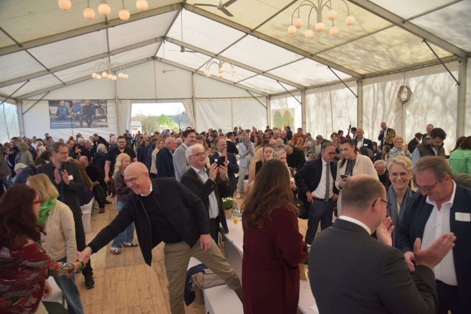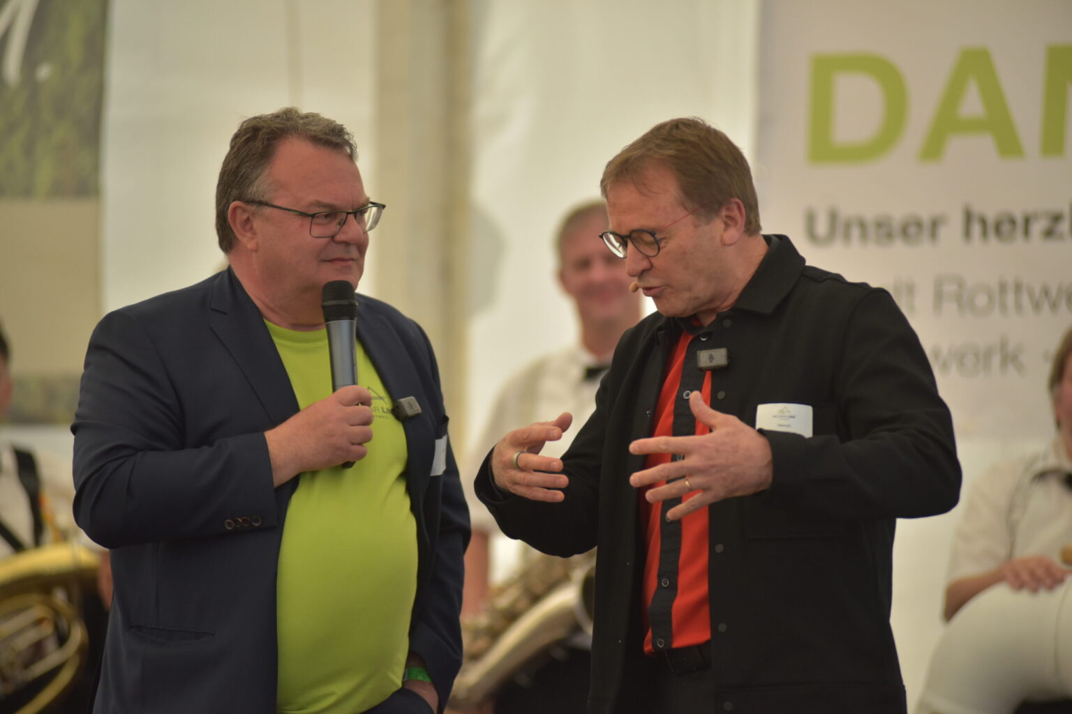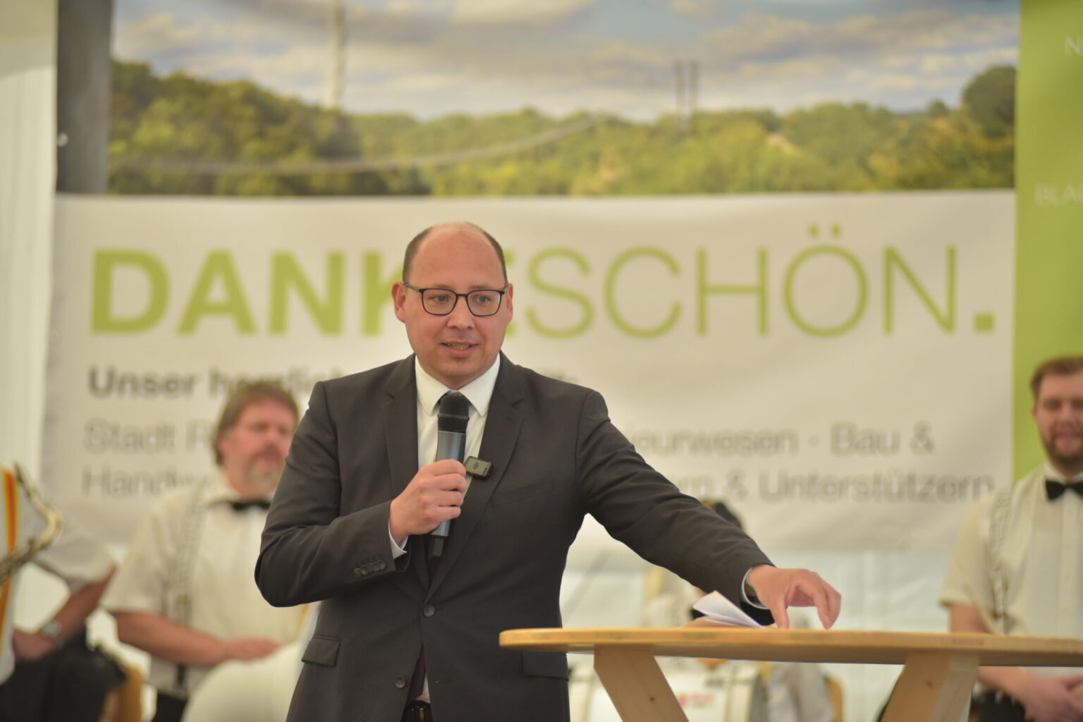Rottweil – Im Festzelt am Besucherzentrum begann das Programm um 10.30 Uhr – zünftig und schmissig eingeleitet von den „Symbadischen Senfonikern“. Vips und Promis waren angekündigt, es fand sich dann neben Oberbürgermeister Dr. Christian Ruf wohl so weitgehend alles ein, was in der Region Rang und Namen und einen gewissen Bekanntheitsgrad hat. Höhepunkt war der symbolische Banddurchschnitt, mit dem die Brücke offiziell eröffnet wurde und über den wir gesondert berichten.