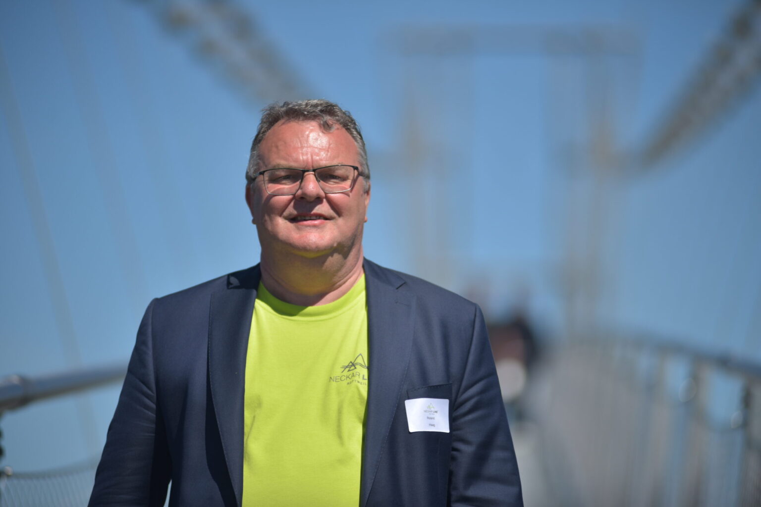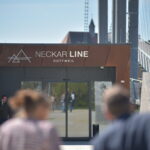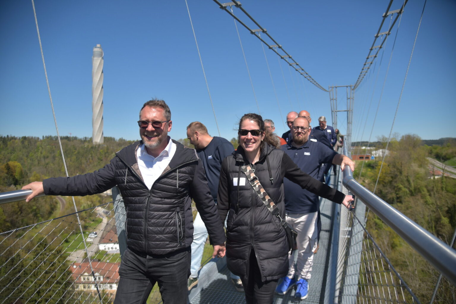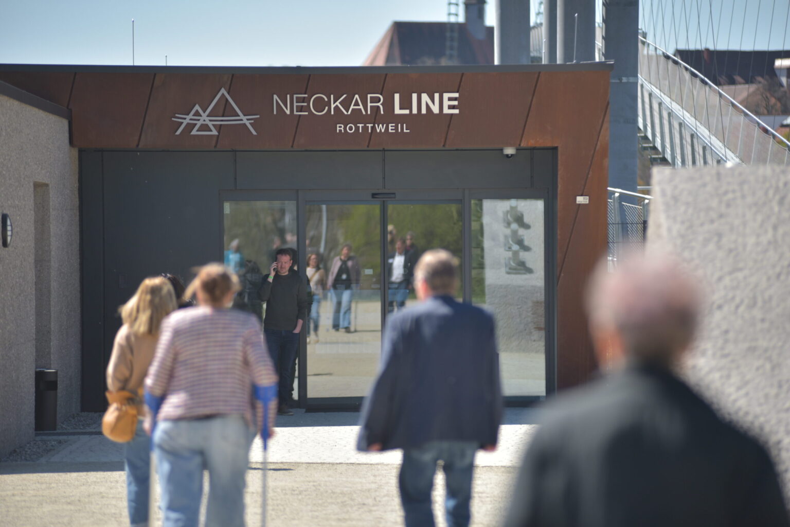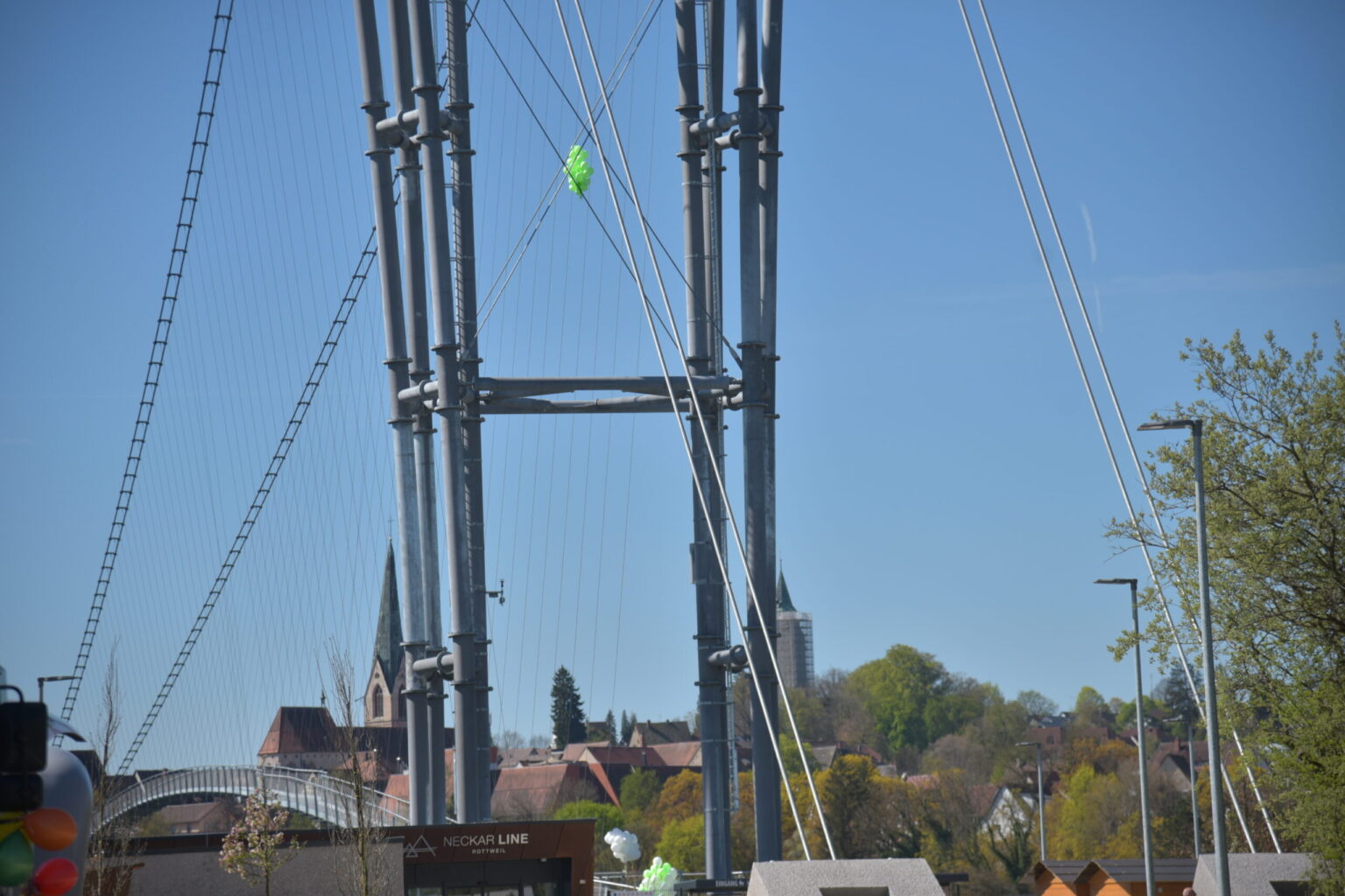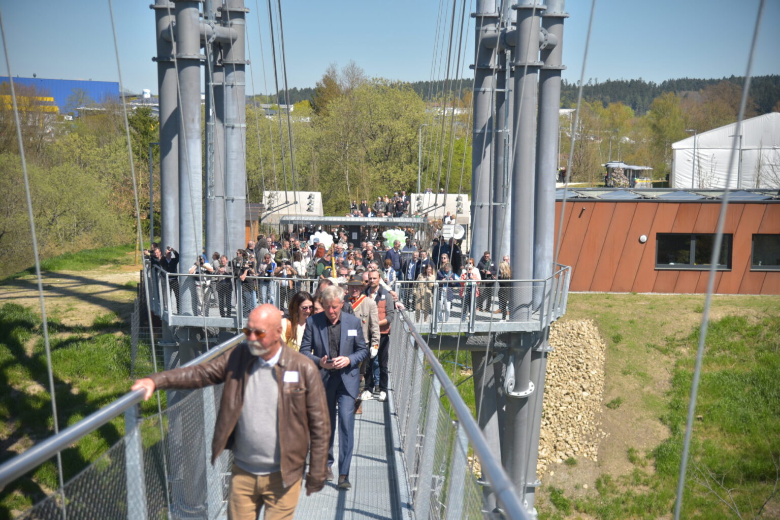 Noch bevor die neue Fußgänger-Hängebrücke Neckarline für die Öffentlichkeit zugänglich ist, wurde sie am Donnerstag, 23. April 2026, im Rahmen einer internen Eröffnungsveranstaltung erstmals offiziell in Betrieb genommen. Rund 300 geladene Gäste aus Politik, Wirtschaft und der Region kamen dazu am Vormittag auf dem Berner Feld zusammen. Sie schwankten anschließend fast allesamt über die neue Brücke auf die Innenstadt zu.