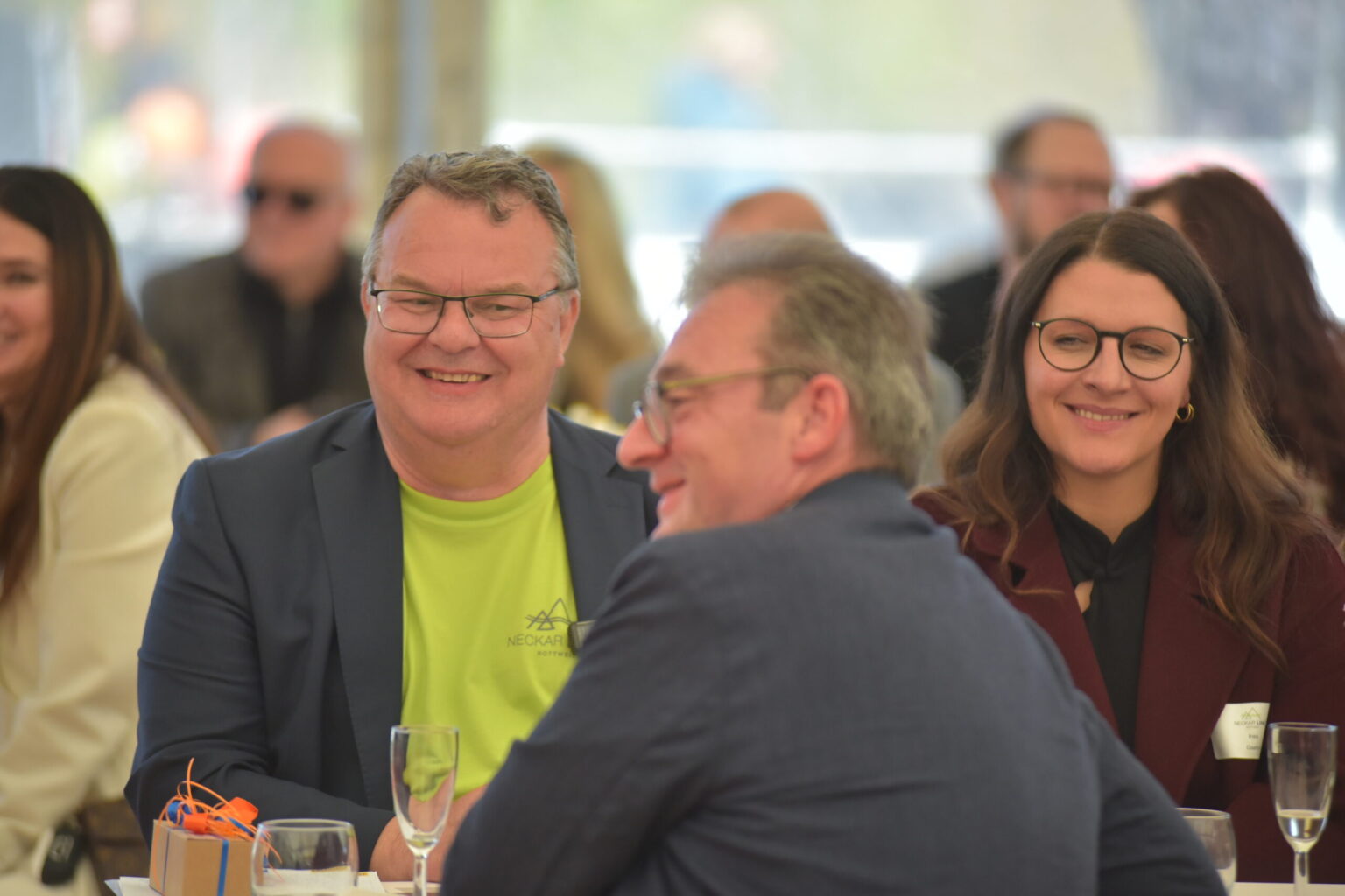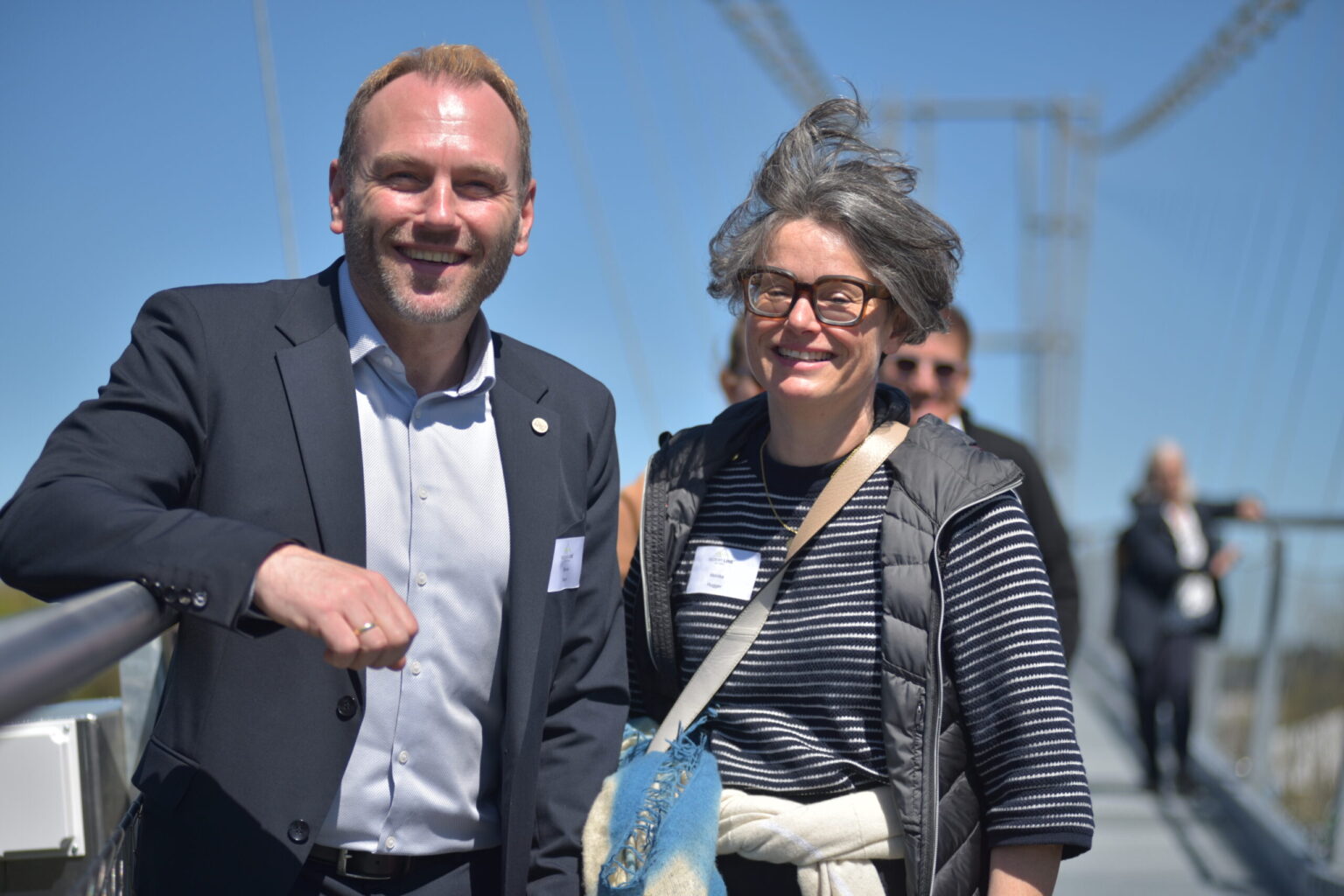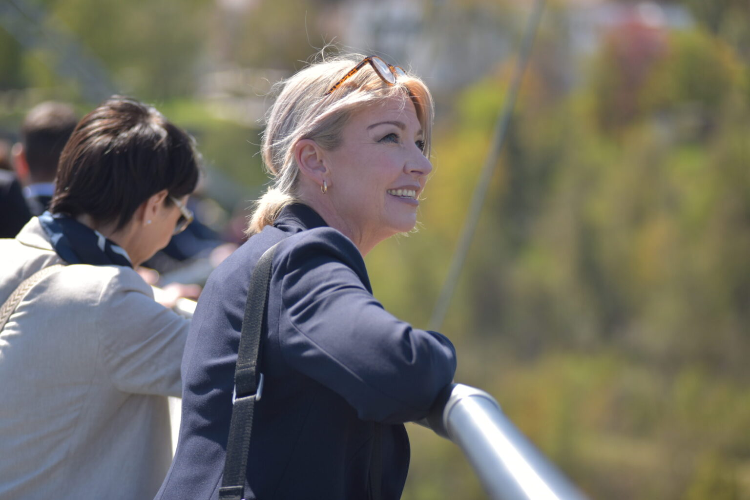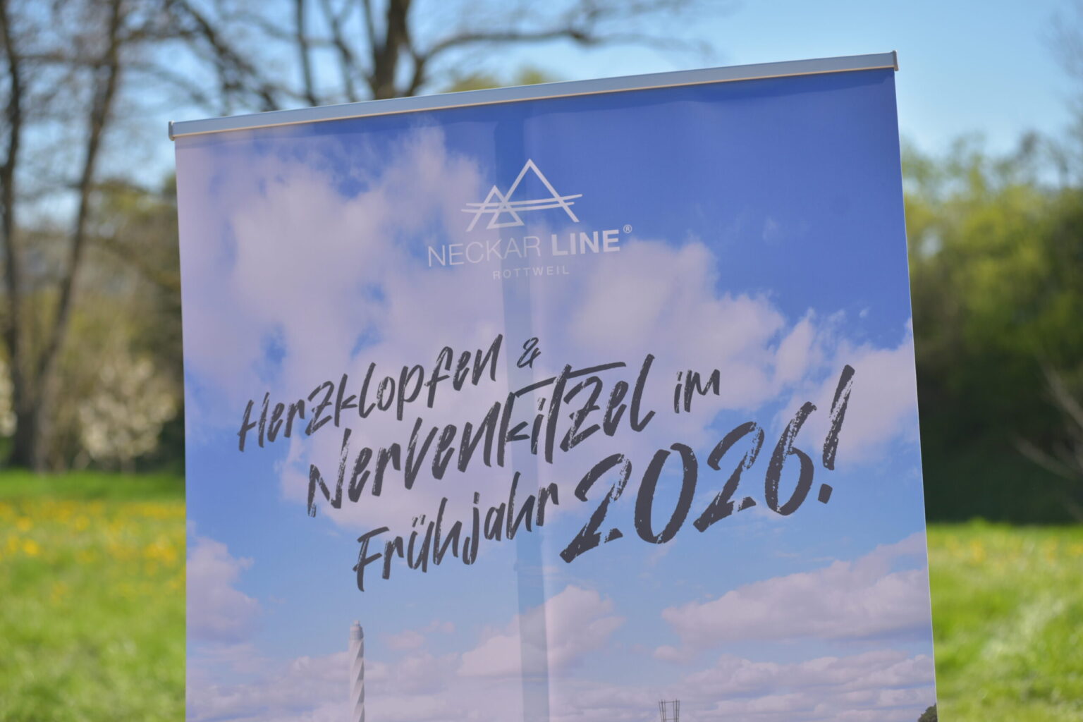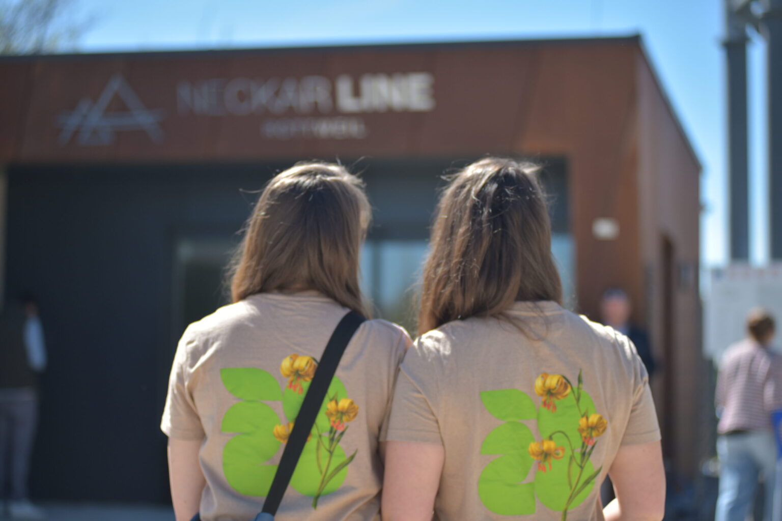 Noch bevor die neue Fußgänger-Hängebrücke Neckarline für die Öffentlichkeit zugänglich ist, wurde sie am Donnerstag, 23. April 2026, im Rahmen einer internen Eröffnungsveranstaltung erstmals offiziell in Betrieb genommen. Rund 300 geladene Gäste aus Politik, Wirtschaft und der Region kamen dazu am Vormittag auf dem Berner Feld zusammen. Sie schwankten anschließend fast allesamt über die neue Brücke auf die Innenstadt zu.