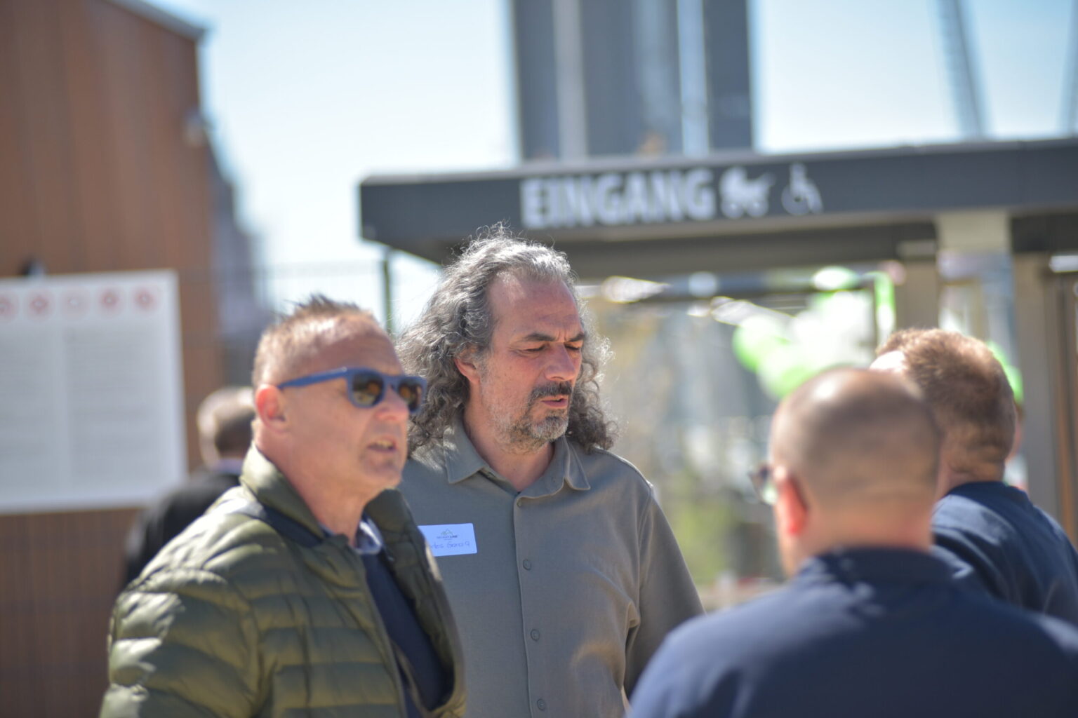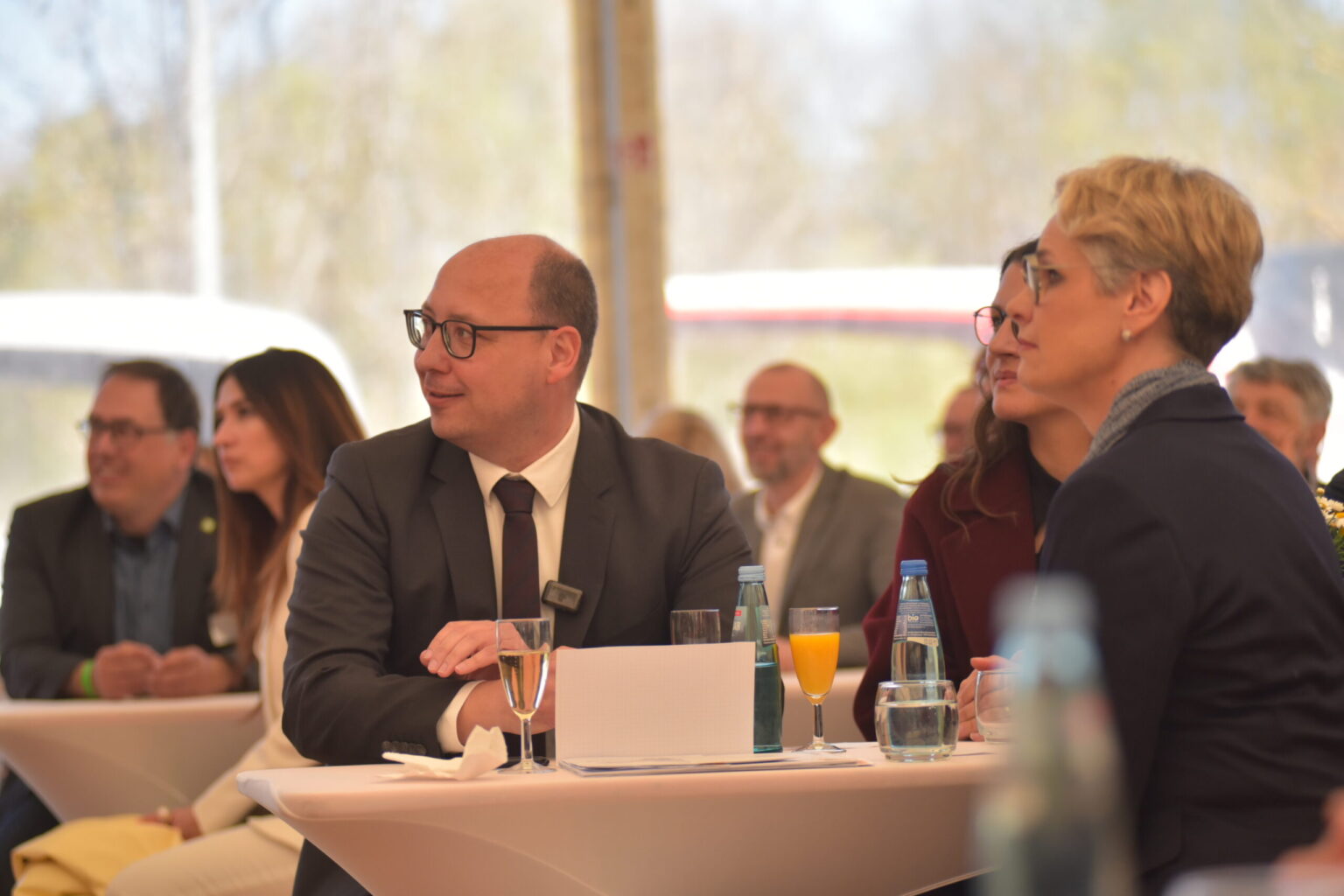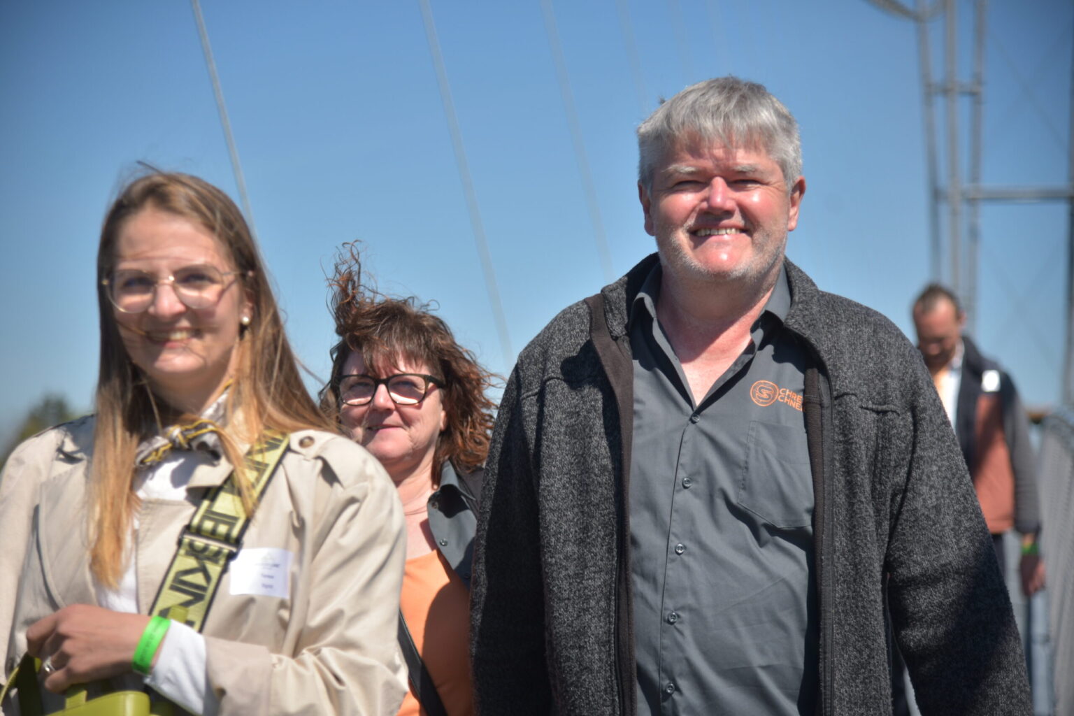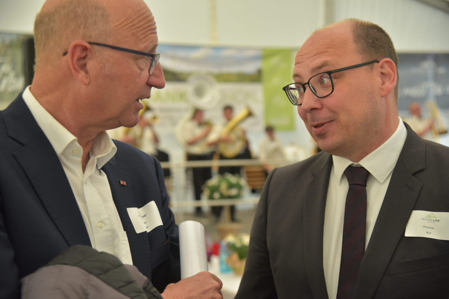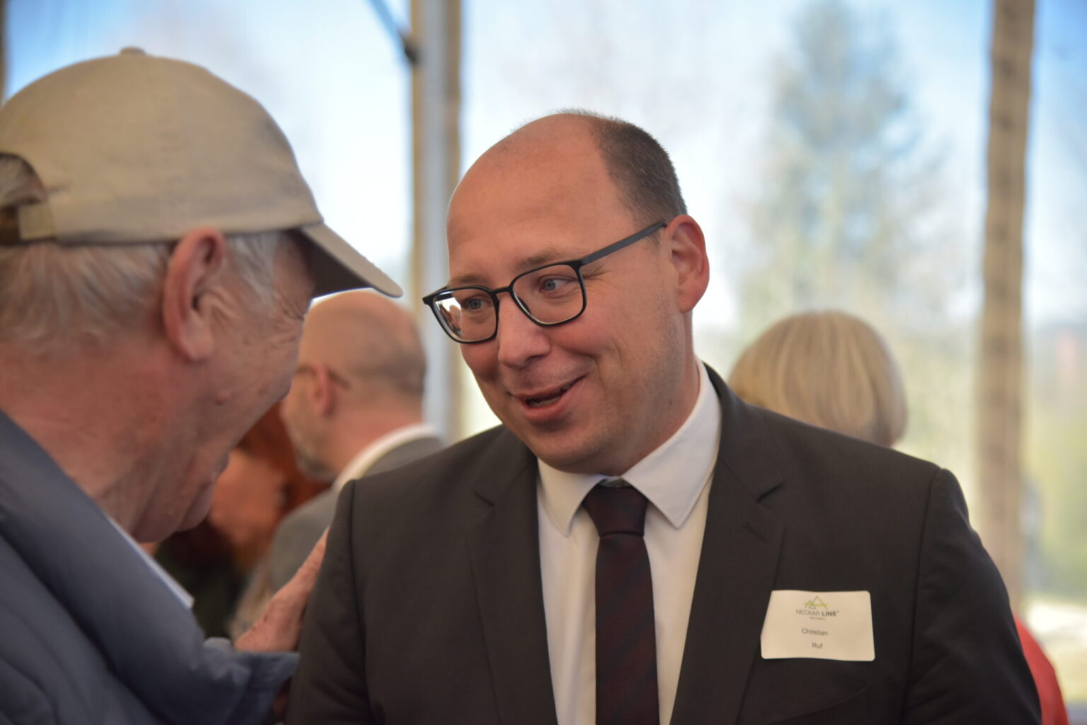 Noch bevor die neue Fußgänger-Hängebrücke Neckarline für die Öffentlichkeit zugänglich ist, wurde sie am Donnerstag, 23. April 2026, im Rahmen einer internen Eröffnungsveranstaltung erstmals offiziell in Betrieb genommen. Rund 300 geladene Gäste aus Politik, Wirtschaft und der Region kamen dazu am Vormittag auf dem Berner Feld zusammen. Sie schwankten anschließend fast allesamt über die neue Brücke auf die Innenstadt zu.